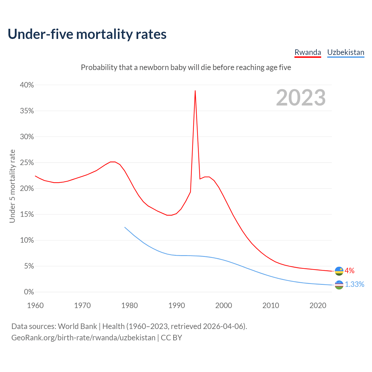 The chance that a newborn baby will die before reaching age five is 4% in Rwanda and 1.33% in Uzbekistan. Above is a chart with historical data on under-five mortality rates.