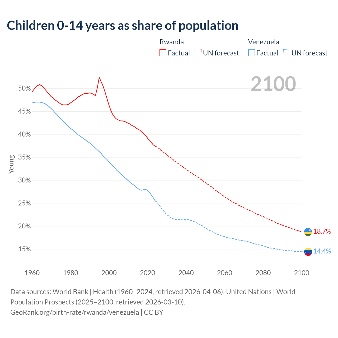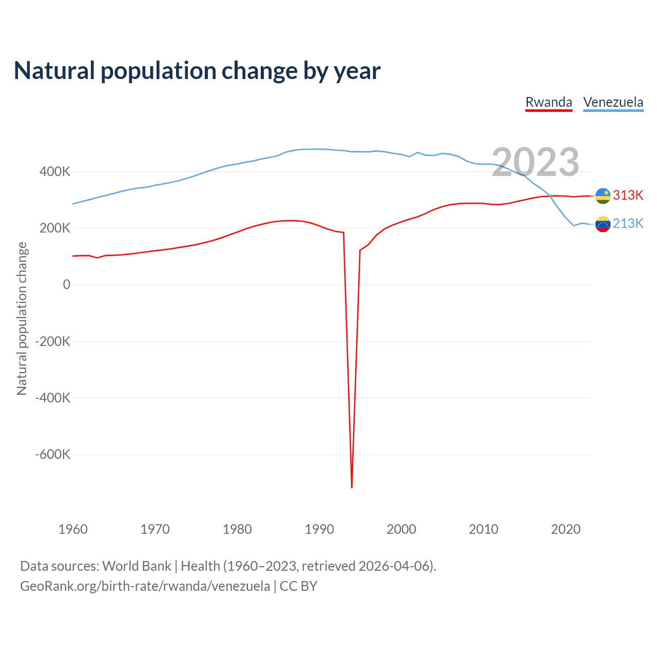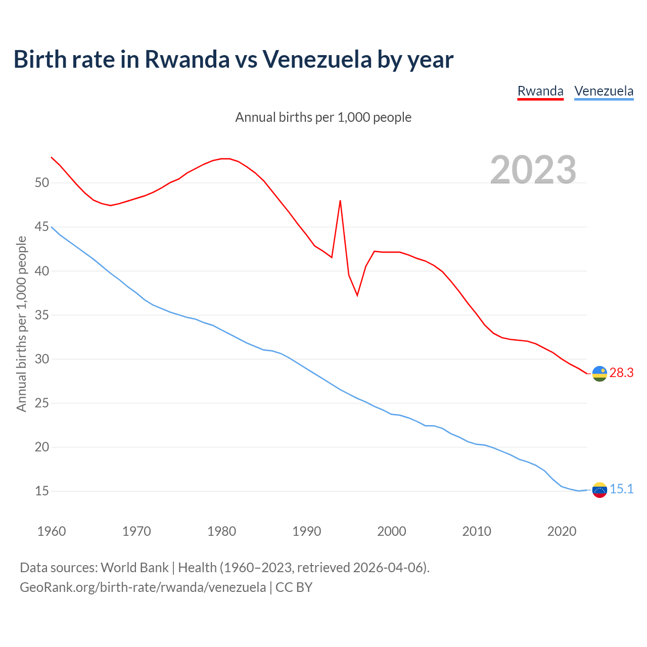 According to the latest available data on birth rates, the fertility rate in Rwanda was 3.7 children per woman in 2023, compared to 2.08 in Venezuela in 2023. The replacement level is considered to be 2.1 children per woman.