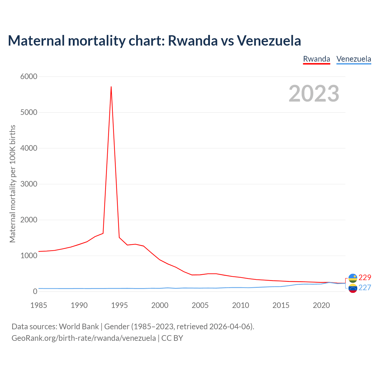 The maternal mortality rate, which is the probability of dying during childbirth or within 42 days of pregnancy termination, is 229 deaths per 100,000 live births in Rwanda, compared to 227 deaths in Venezuela.