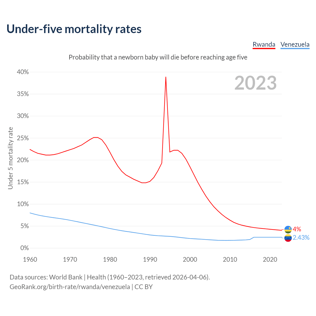 The chance that a newborn baby will die before reaching age five is 4% in Rwanda and 2.43% in Venezuela. Above is a chart with historical data on under-five mortality rates.