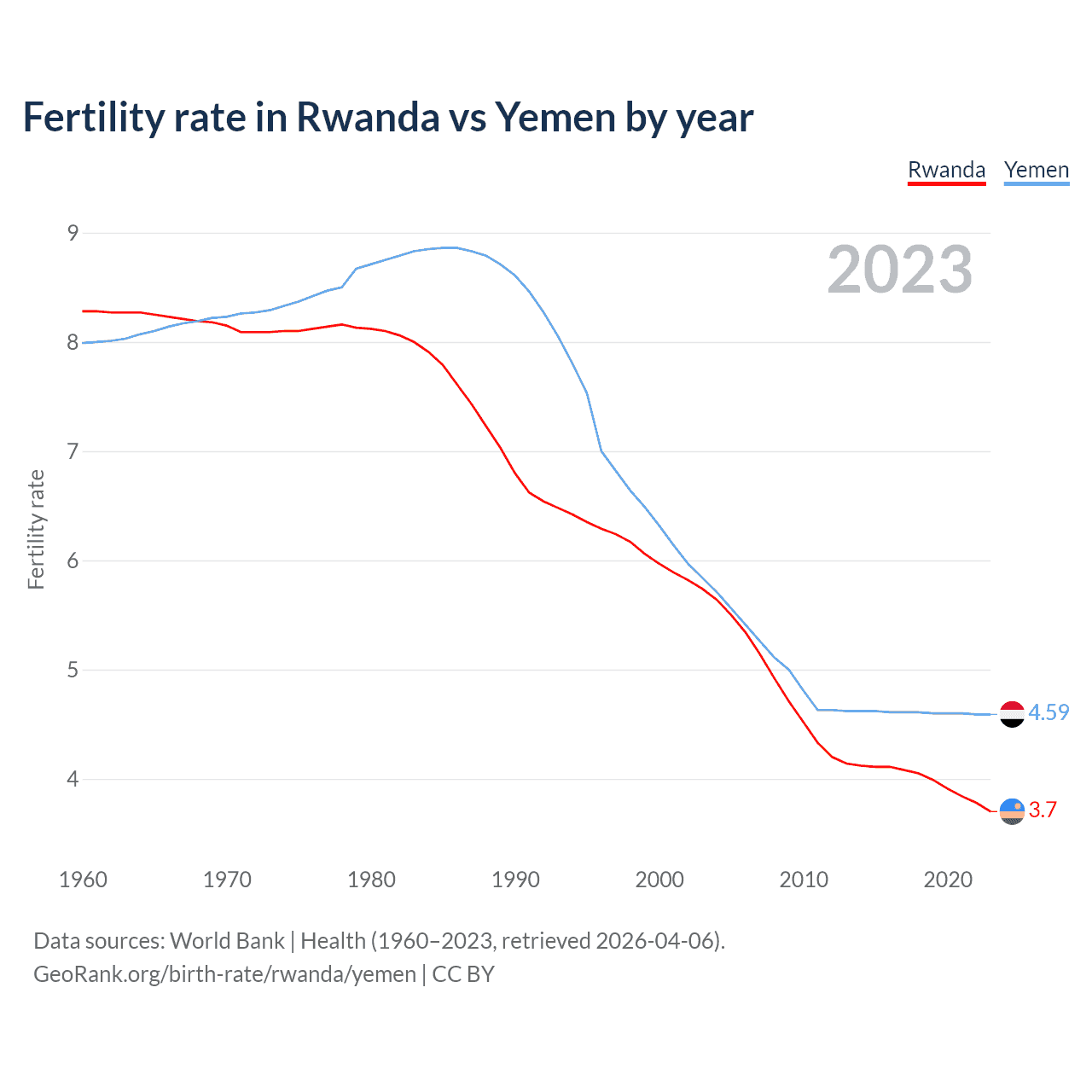 Fertility rate in Rwanda vs Yemen by year