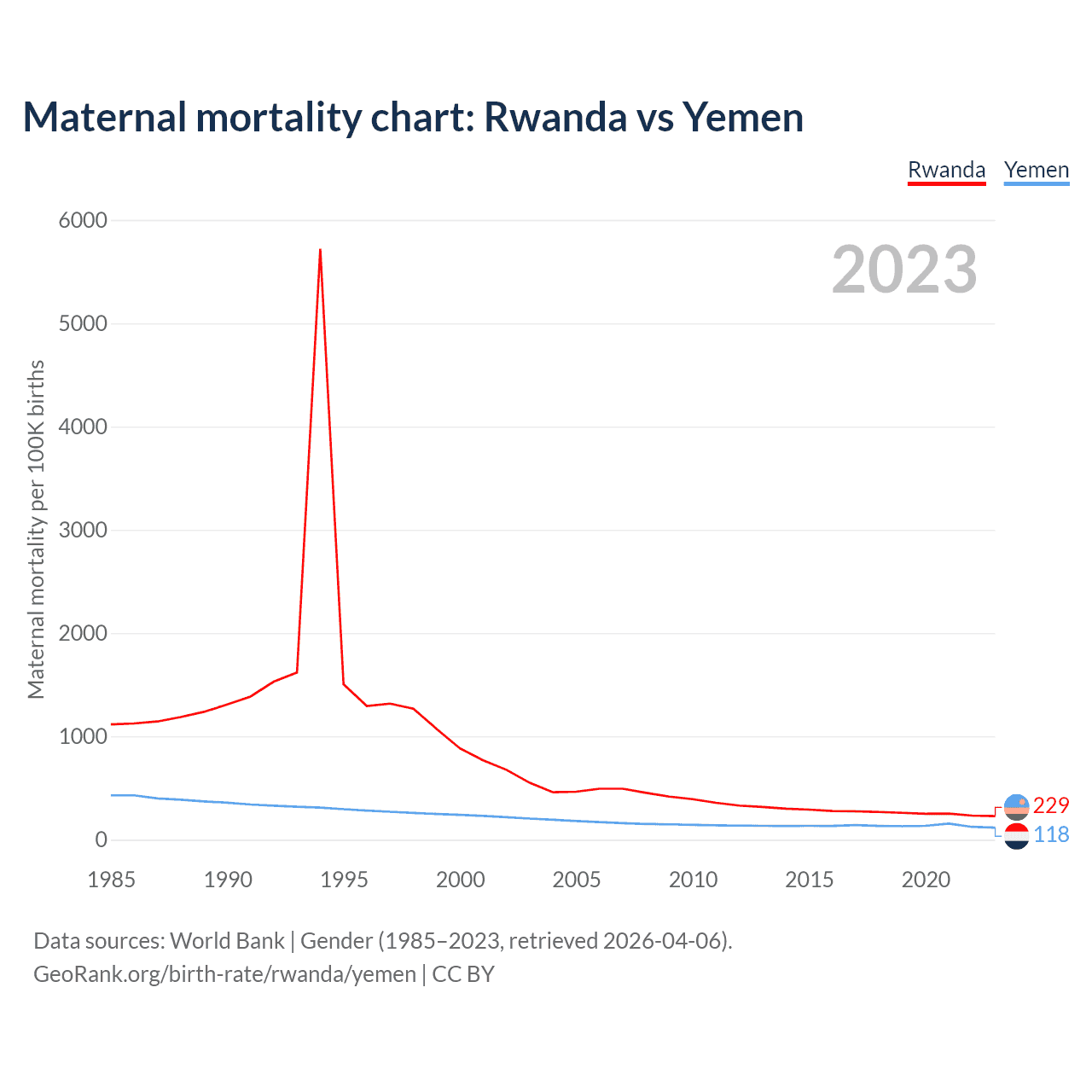 The maternal mortality rate, which is the probability of dying during childbirth or within 42 days of pregnancy termination, is 229 deaths per 100,000 live births in Rwanda, compared to 118 deaths in Yemen.