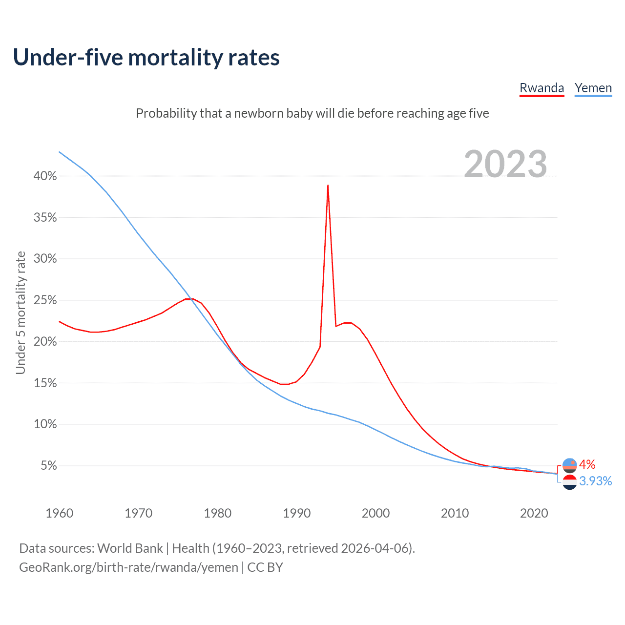 The chance that a newborn baby will die before reaching age five is 4% in Rwanda and 3.93% in Yemen. Above is a chart with historical data on under-five mortality rates.