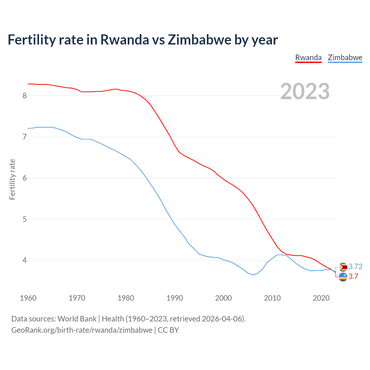 1960 vs 2023, the fertility rate has decreased by 55.4% in Rwanda and by 48.2% in Zimbabwe — in 1960, it was 8.28 and 7.2, respectively.