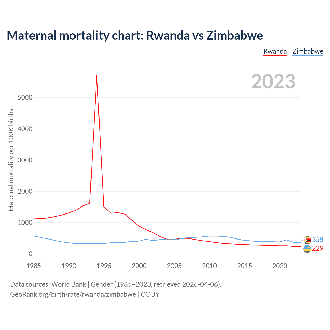 The maternal mortality rate, which is the probability of dying during childbirth or within 42 days of pregnancy termination, is 229 deaths per 100,000 live births in Rwanda, compared to 358 deaths in Zimbabwe.