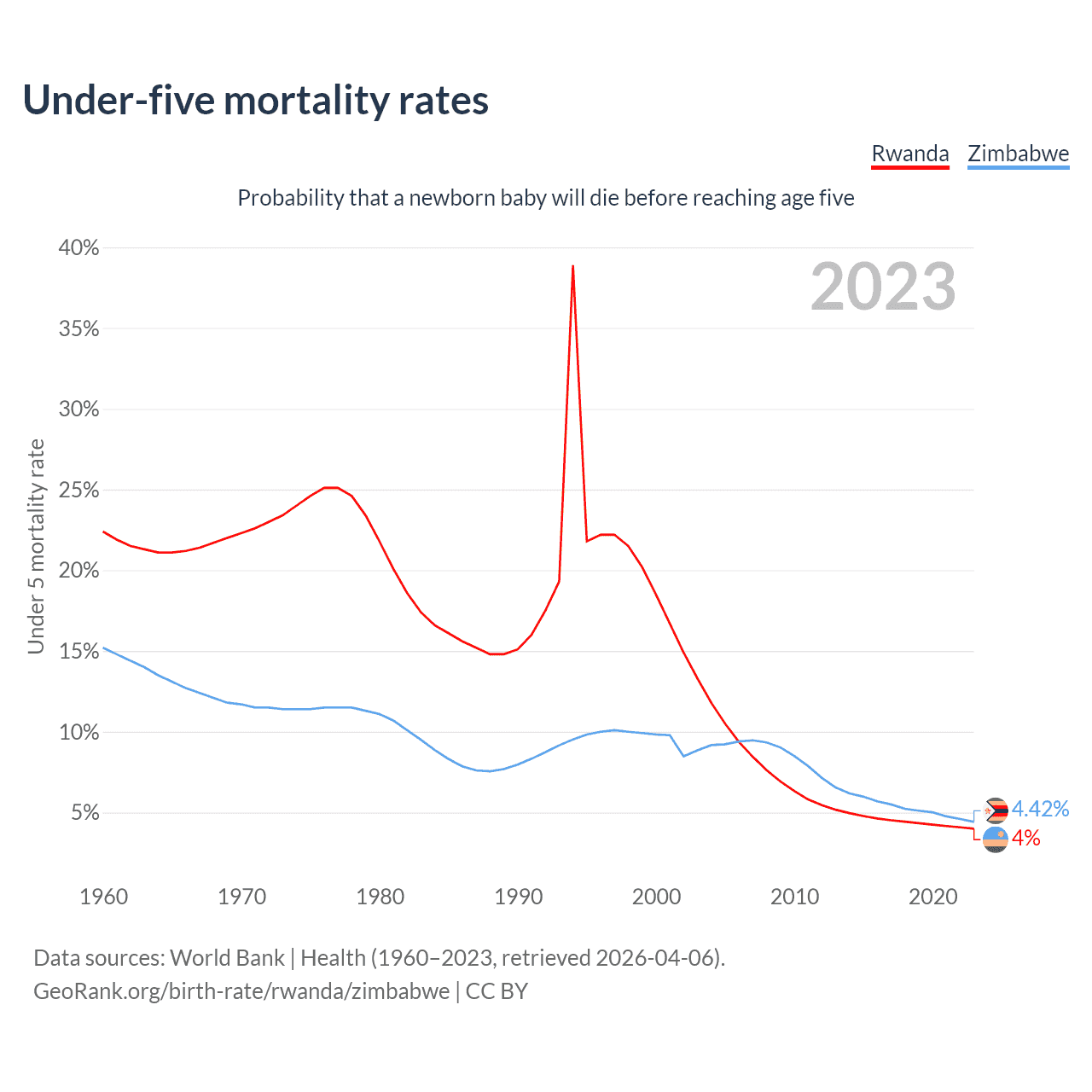 The chance that a newborn baby will die before reaching age five is 4% in Rwanda and 4.42% in Zimbabwe. Above is a chart with historical data on under-five mortality rates.