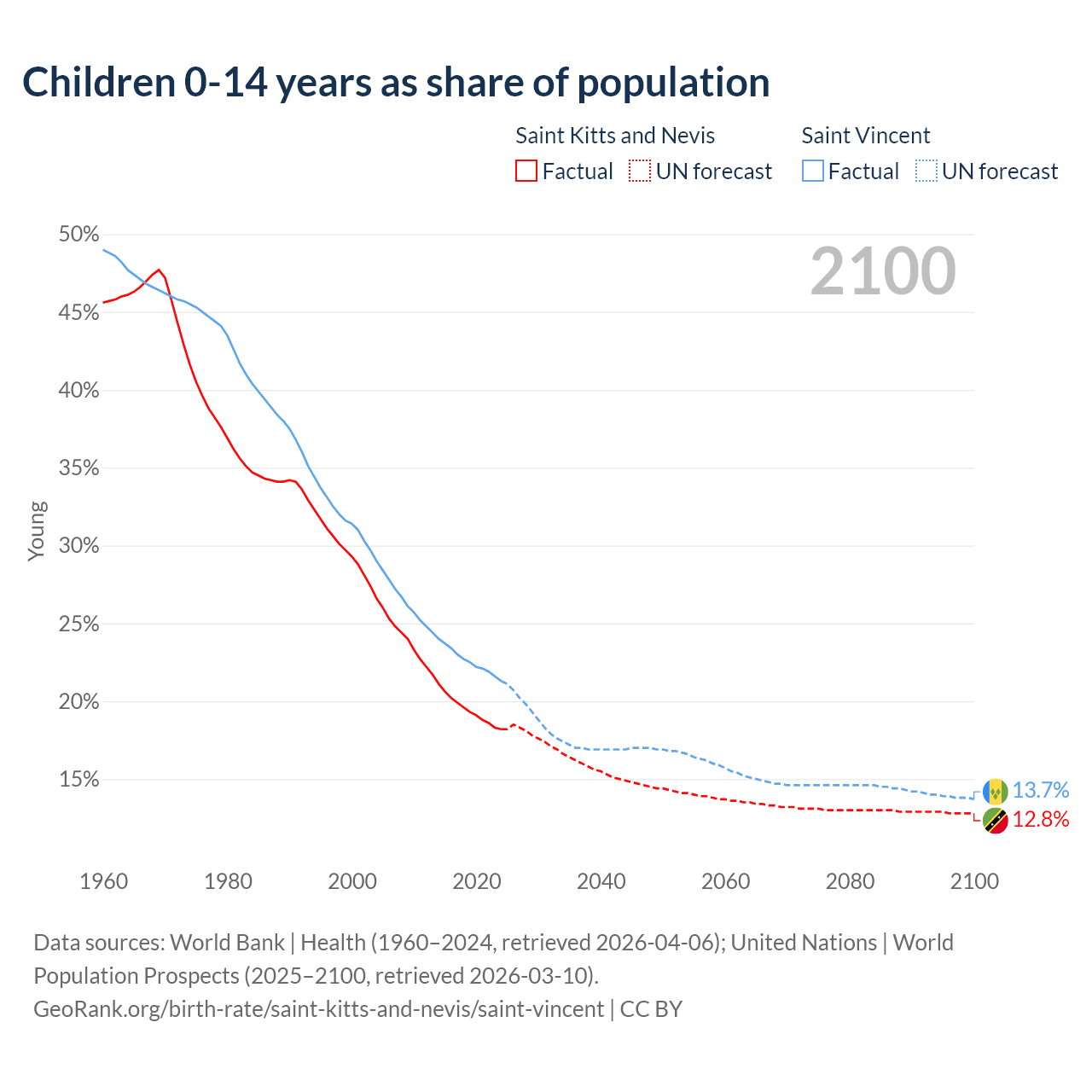 1960 vs 2023, the fertility rate has decreased by 77% in Saint Kitts and Nevis and by 75.5% in Saint Vincent — in 1960, it was 6.54 and 7.25, respectively.