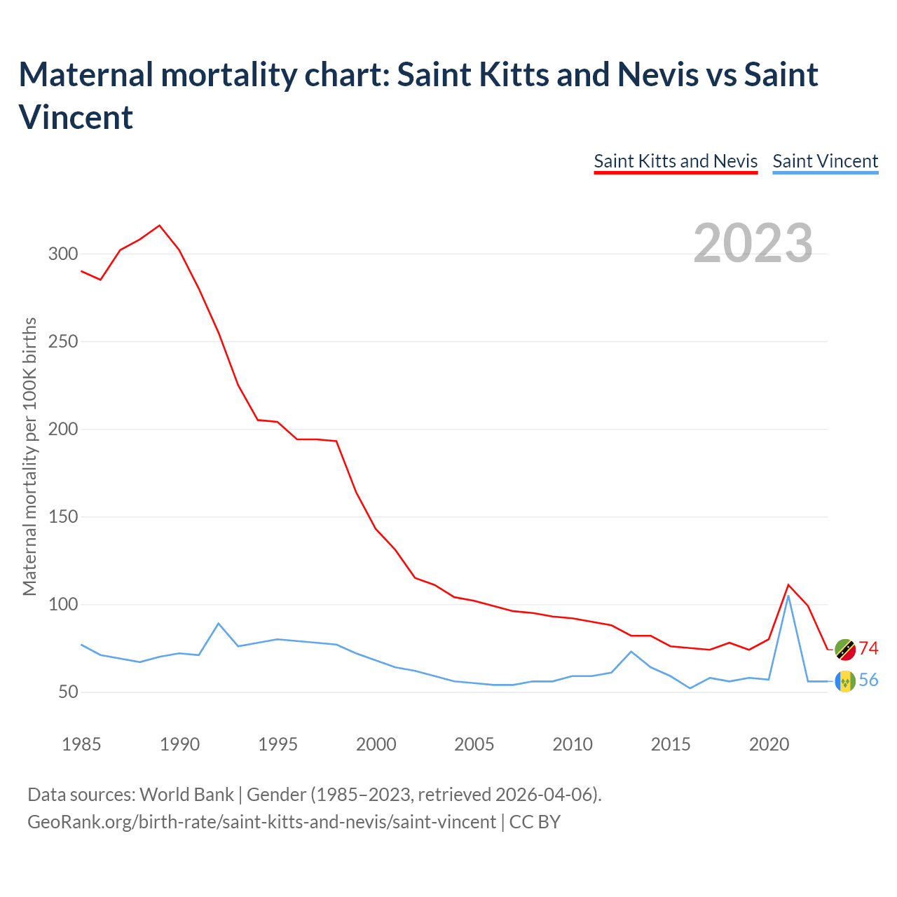 The maternal mortality rate, which is the probability of dying during childbirth or within 42 days of pregnancy termination, is 74 deaths per 100,000 live births in Saint Kitts and Nevis, compared to 56 deaths in Saint Vincent.