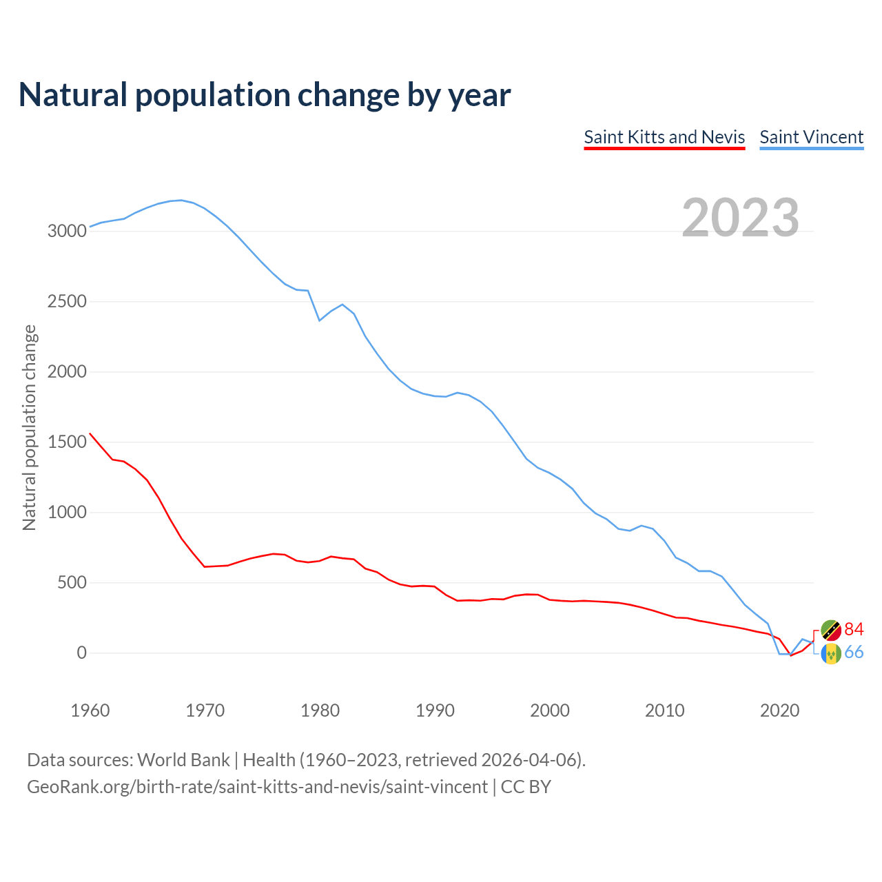 According to the latest available data on birth rates, the fertility rate in Saint Kitts and Nevis was 1.51 children per woman in 2023, compared to 1.78 in Saint Vincent in 2023. The replacement level is considered to be 2.1 children per woman.