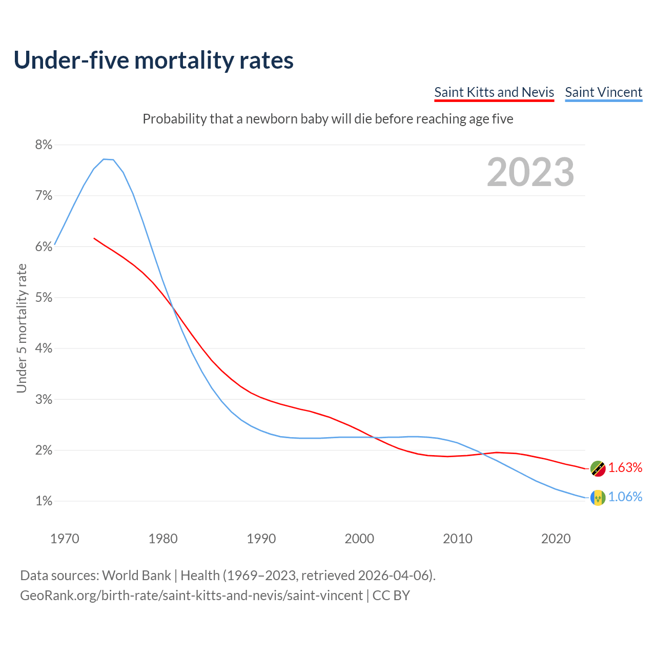 The chance that a newborn baby will die before reaching age five is 1.63% in Saint Kitts and Nevis and 1.06% in Saint Vincent. Above is a chart with historical data on under-five mortality rates.