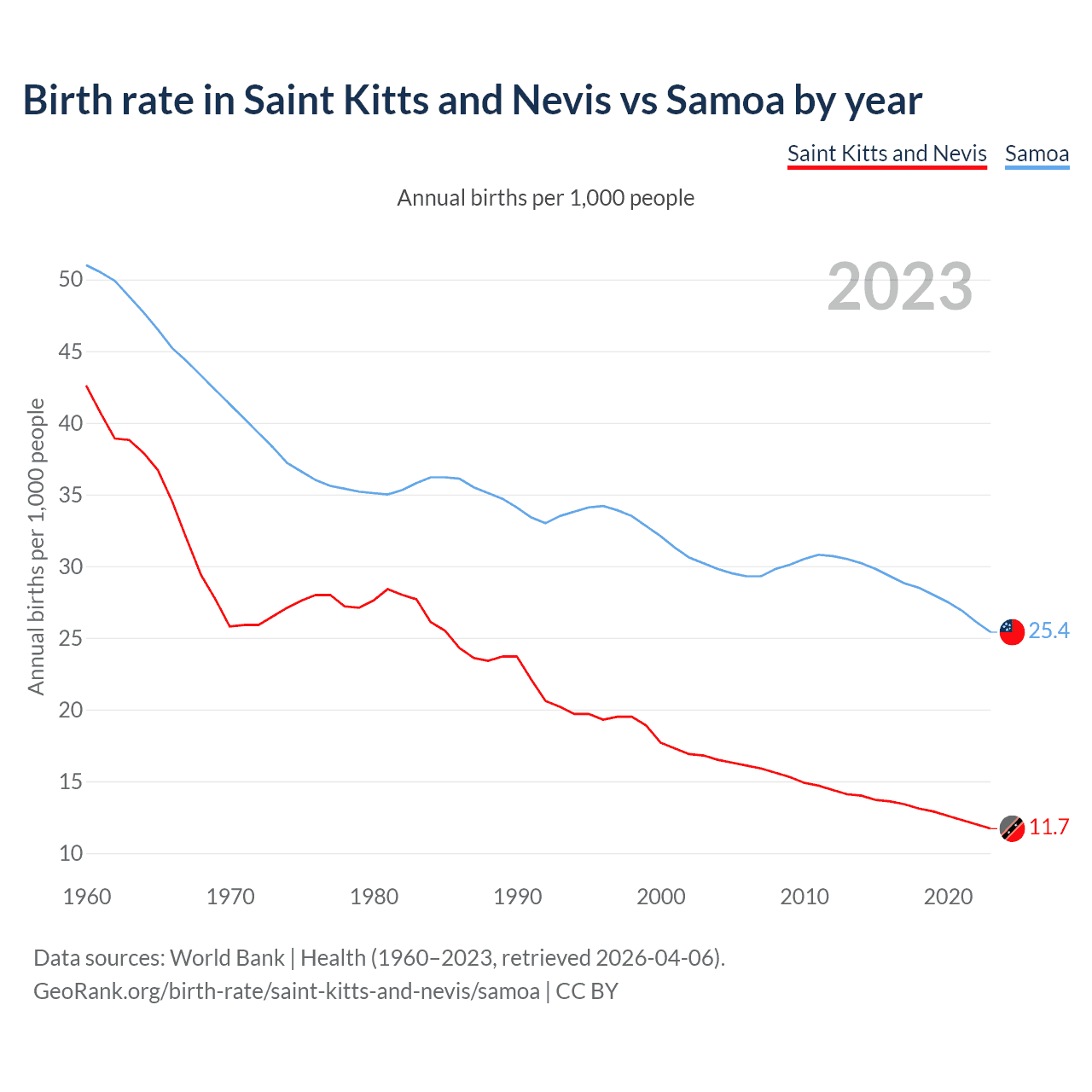Saint Kitts and Nevis has an annual birth rate of 11.7 births per 1,000 people, compared to 25.4 for Samoa. The average number of children a woman is expected to have during her lifetime — the fertility rate, is 1.51 in Saint Kitts and Nevis and 3.83 in Samoa — 154.4% difference.