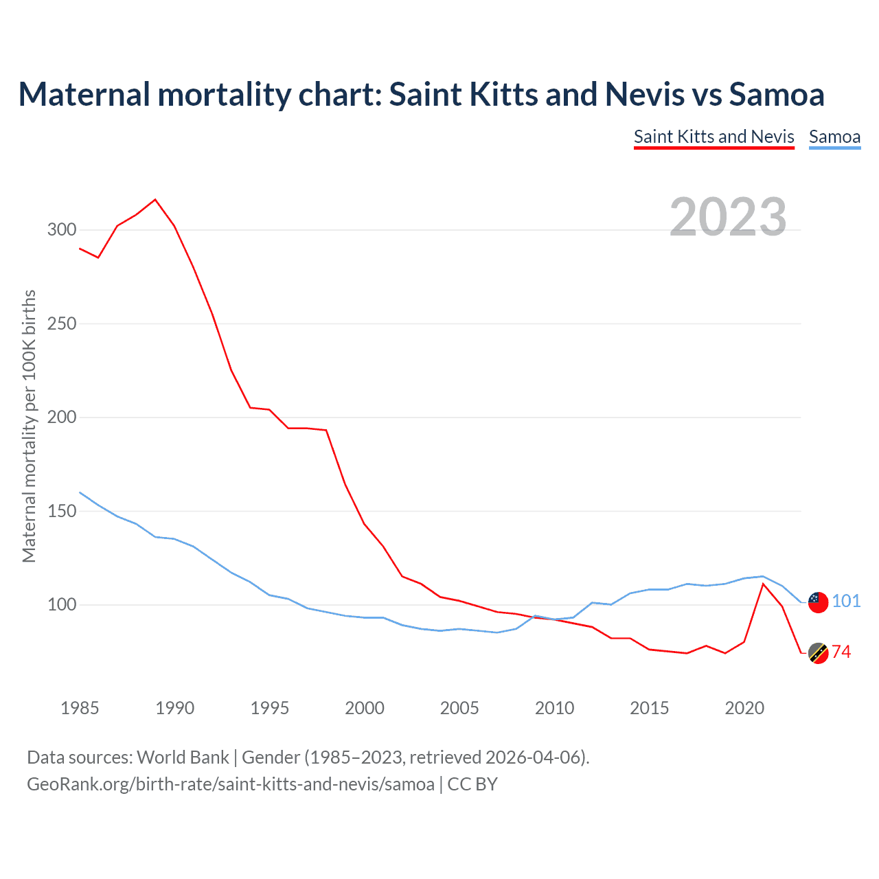 The maternal mortality rate, which is the probability of dying during childbirth or within 42 days of pregnancy termination, is 74 deaths per 100,000 live births in Saint Kitts and Nevis, compared to 101 deaths in Samoa.