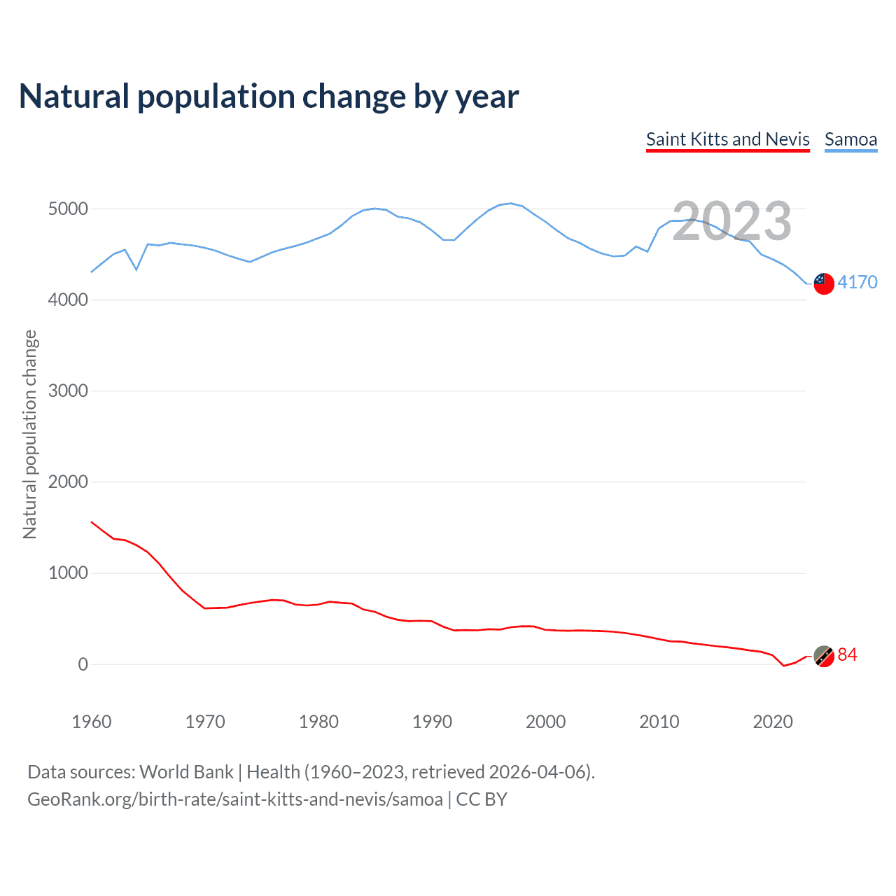 According to the latest available data on birth rates, the fertility rate in Saint Kitts and Nevis was 1.51 children per woman in 2023, compared to 3.83 in Samoa in 2023. The replacement level is considered to be 2.1 children per woman.