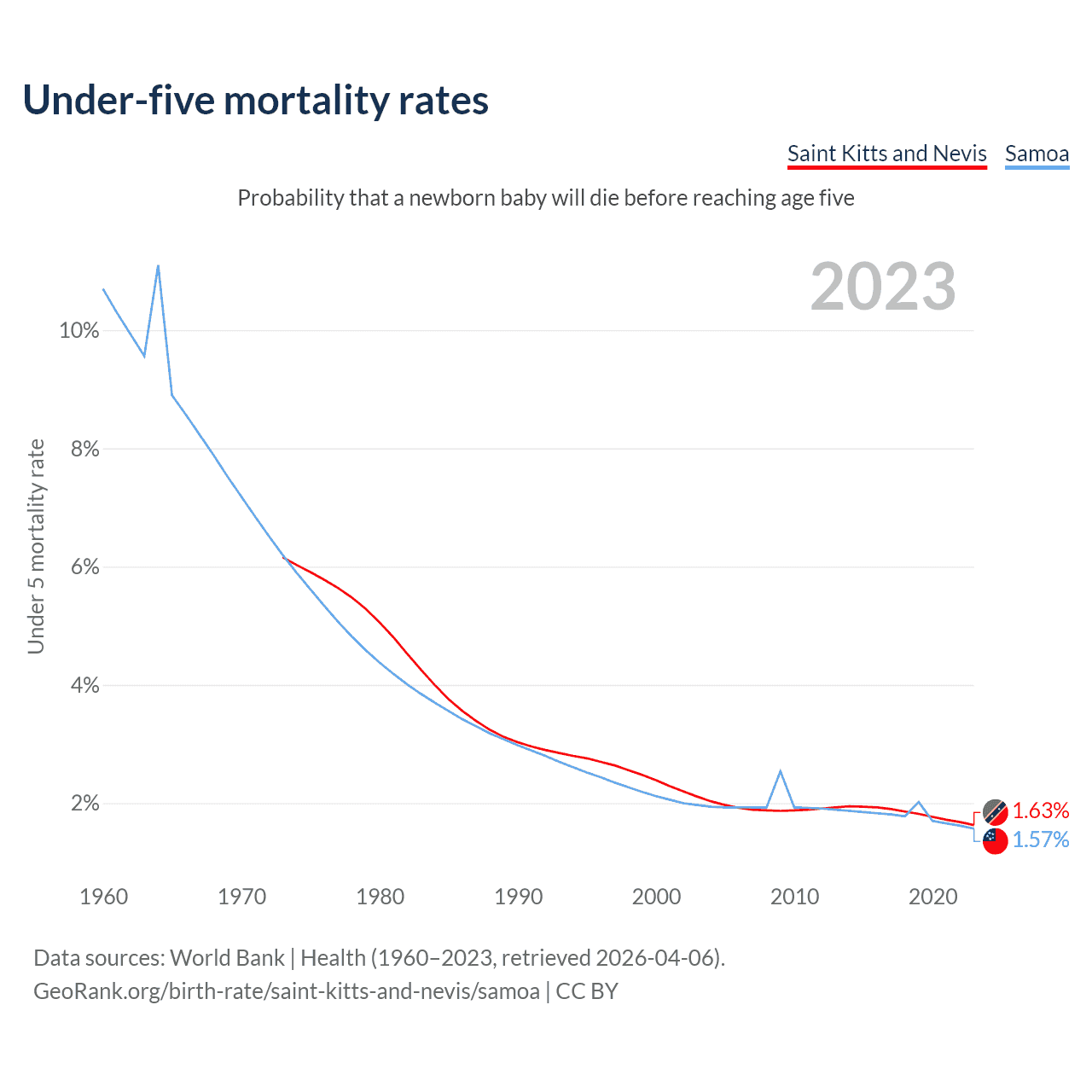 The chance that a newborn baby will die before reaching age five is 1.63% in Saint Kitts and Nevis and 1.57% in Samoa. Above is a chart with historical data on under-five mortality rates.