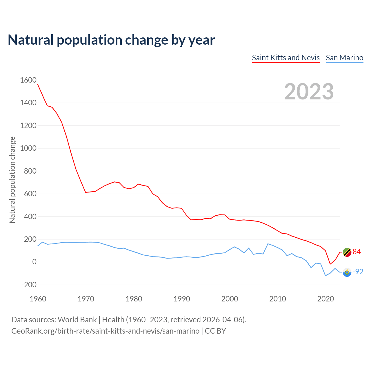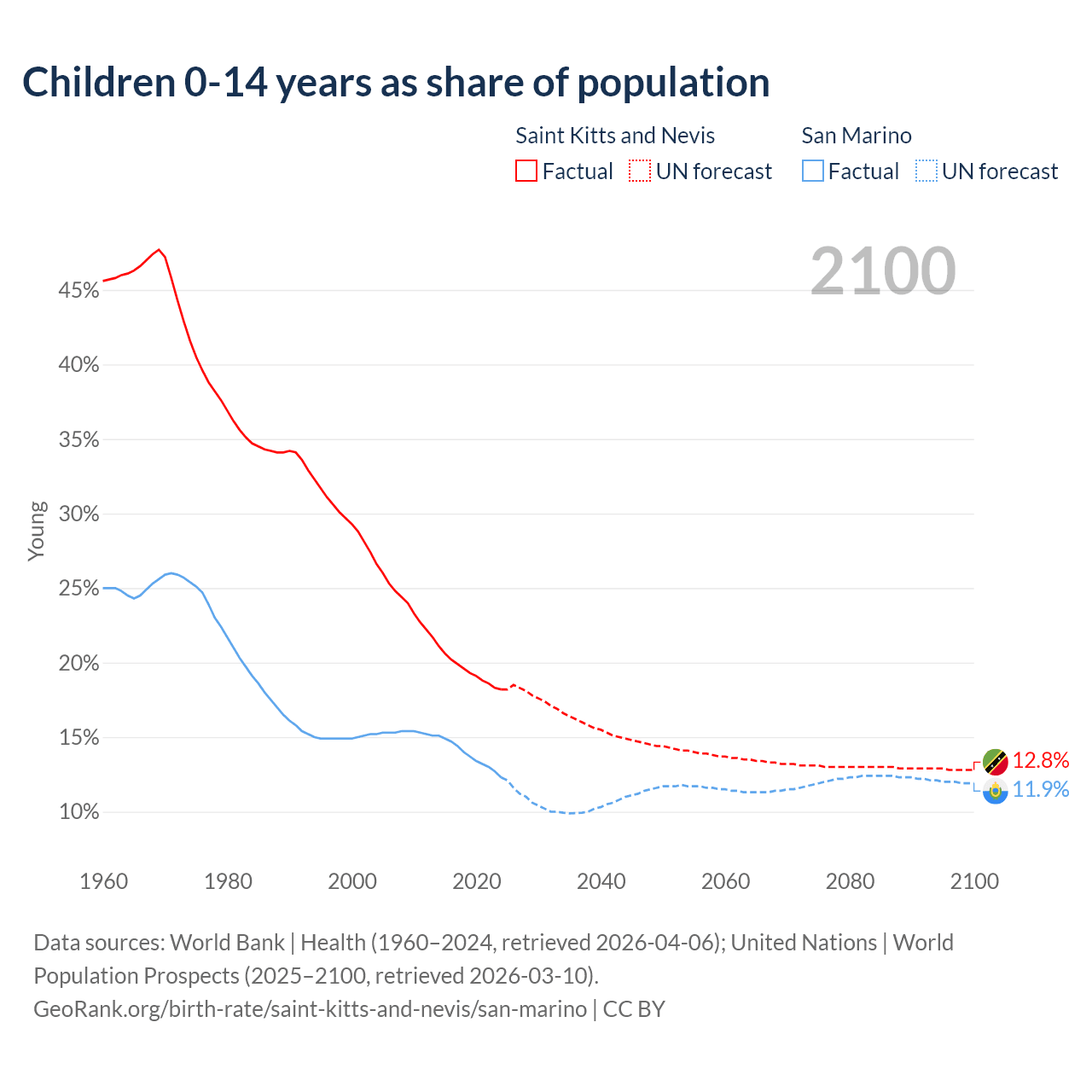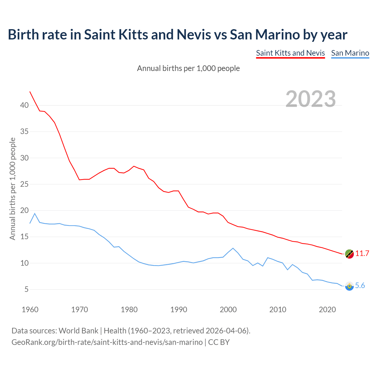 According to the latest available data on birth rates, the fertility rate in Saint Kitts and Nevis was 1.51 children per woman in 2023, compared to 1.15 in San Marino in 2023. The replacement level is considered to be 2.1 children per woman.