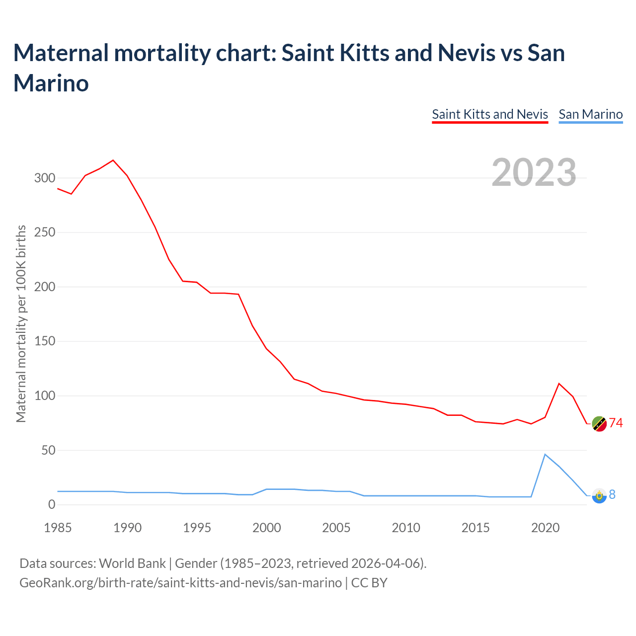 The maternal mortality rate, which is the probability of dying during childbirth or within 42 days of pregnancy termination, is 74 deaths per 100,000 live births in Saint Kitts and Nevis, compared to 8 deaths in San Marino.