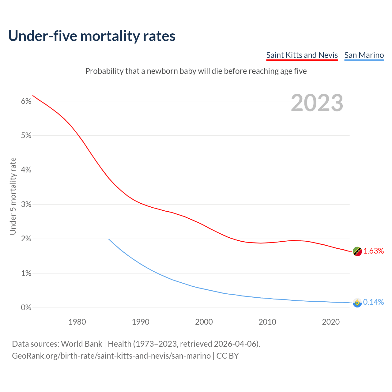 The chance that a newborn baby will die before reaching age five is 1.63% in Saint Kitts and Nevis and 0.14% in San Marino. Above is a chart with historical data on under-five mortality rates.