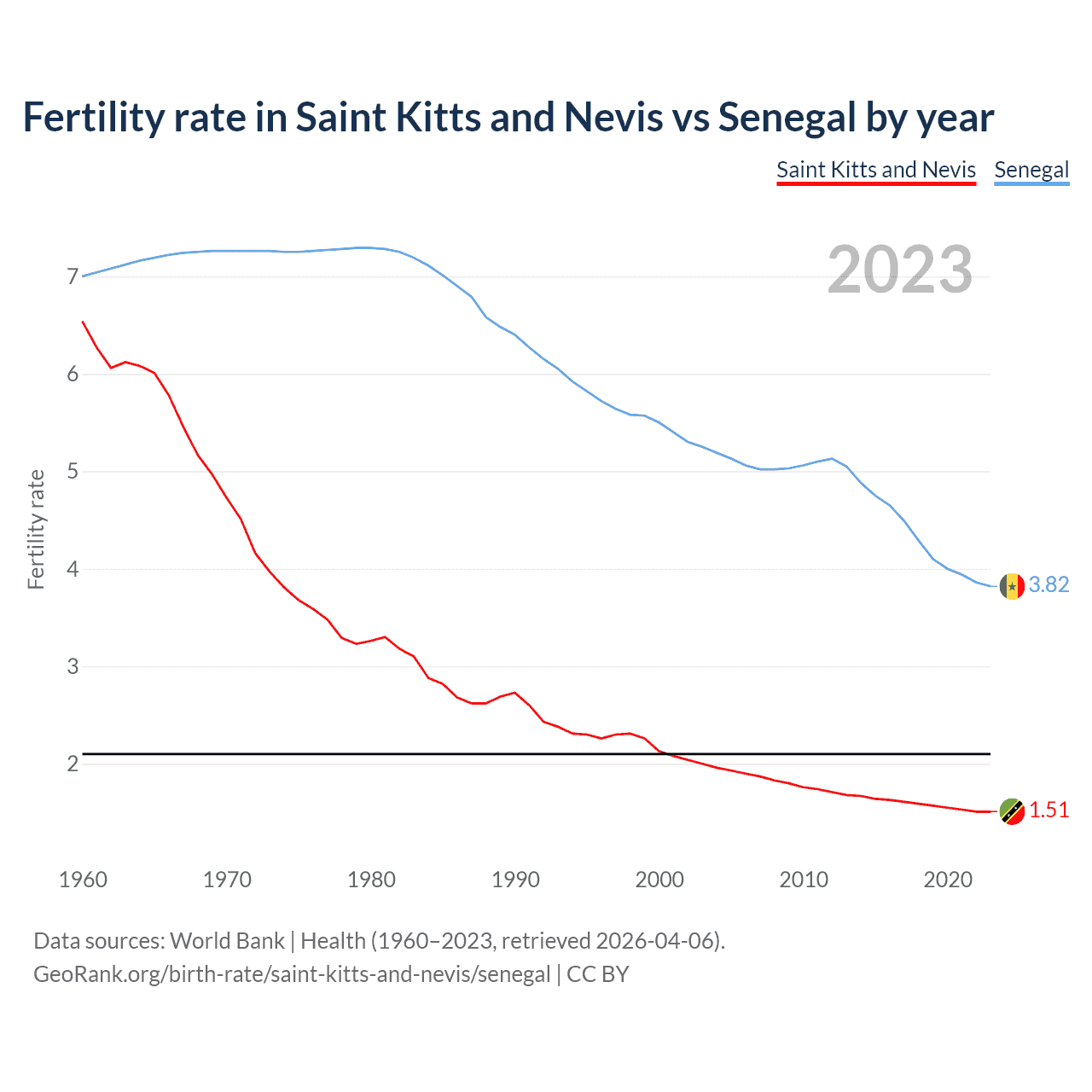 1960 vs 2023, the fertility rate has decreased by 77% in Saint Kitts and Nevis and by 45.4% in Senegal — in 1960, it was 6.54 and 7, respectively.