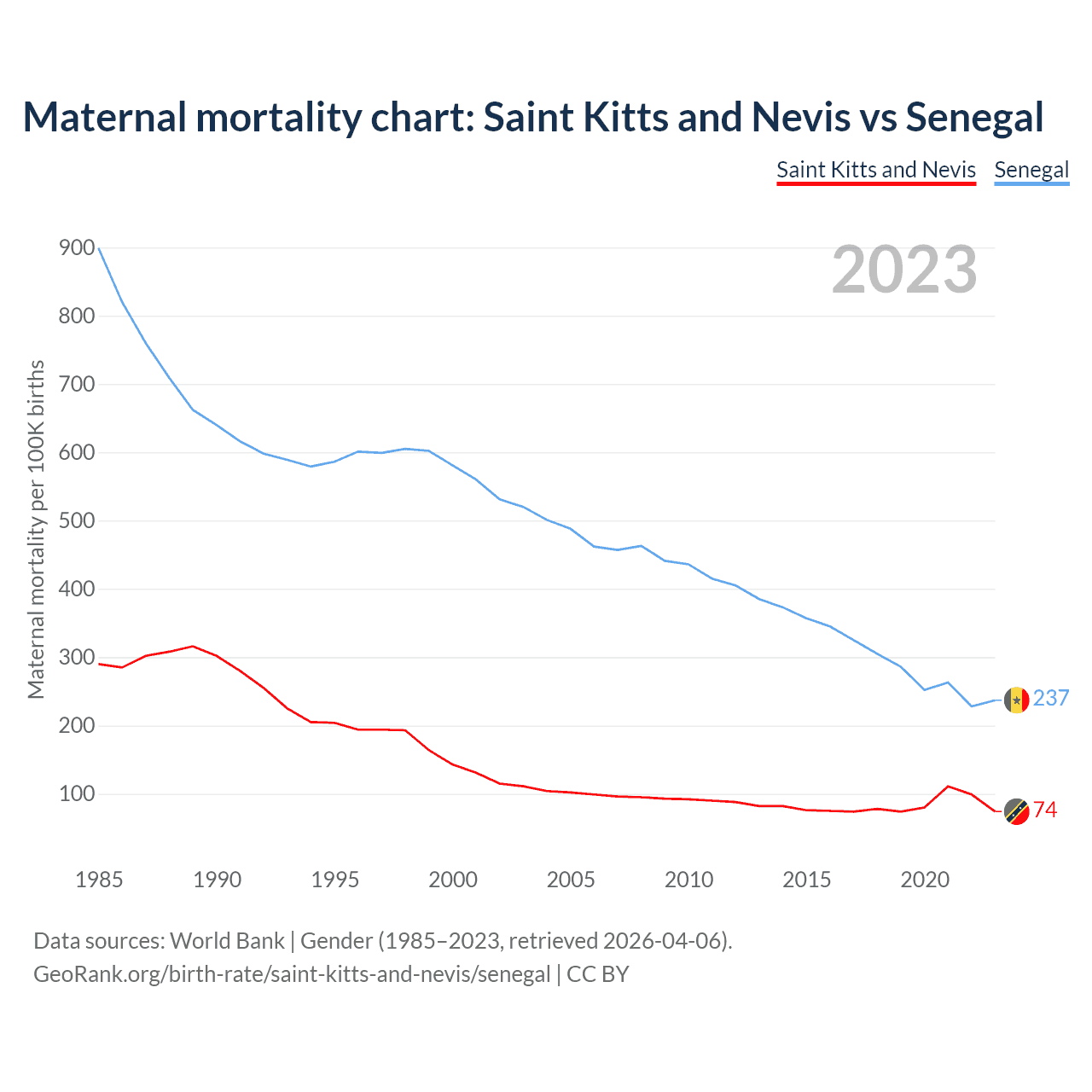 The maternal mortality rate, which is the probability of dying during childbirth or within 42 days of pregnancy termination, is 74 deaths per 100,000 live births in Saint Kitts and Nevis, compared to 237 deaths in Senegal.