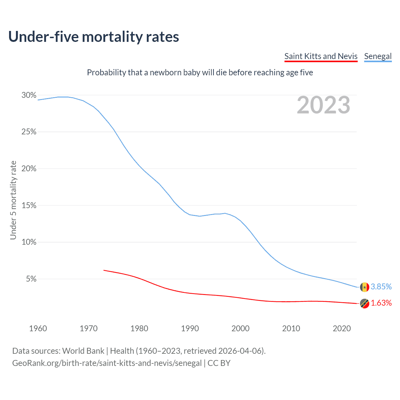 The chance that a newborn baby will die before reaching age five is 1.63% in Saint Kitts and Nevis and 3.85% in Senegal. Above is a chart with historical data on under-five mortality rates.