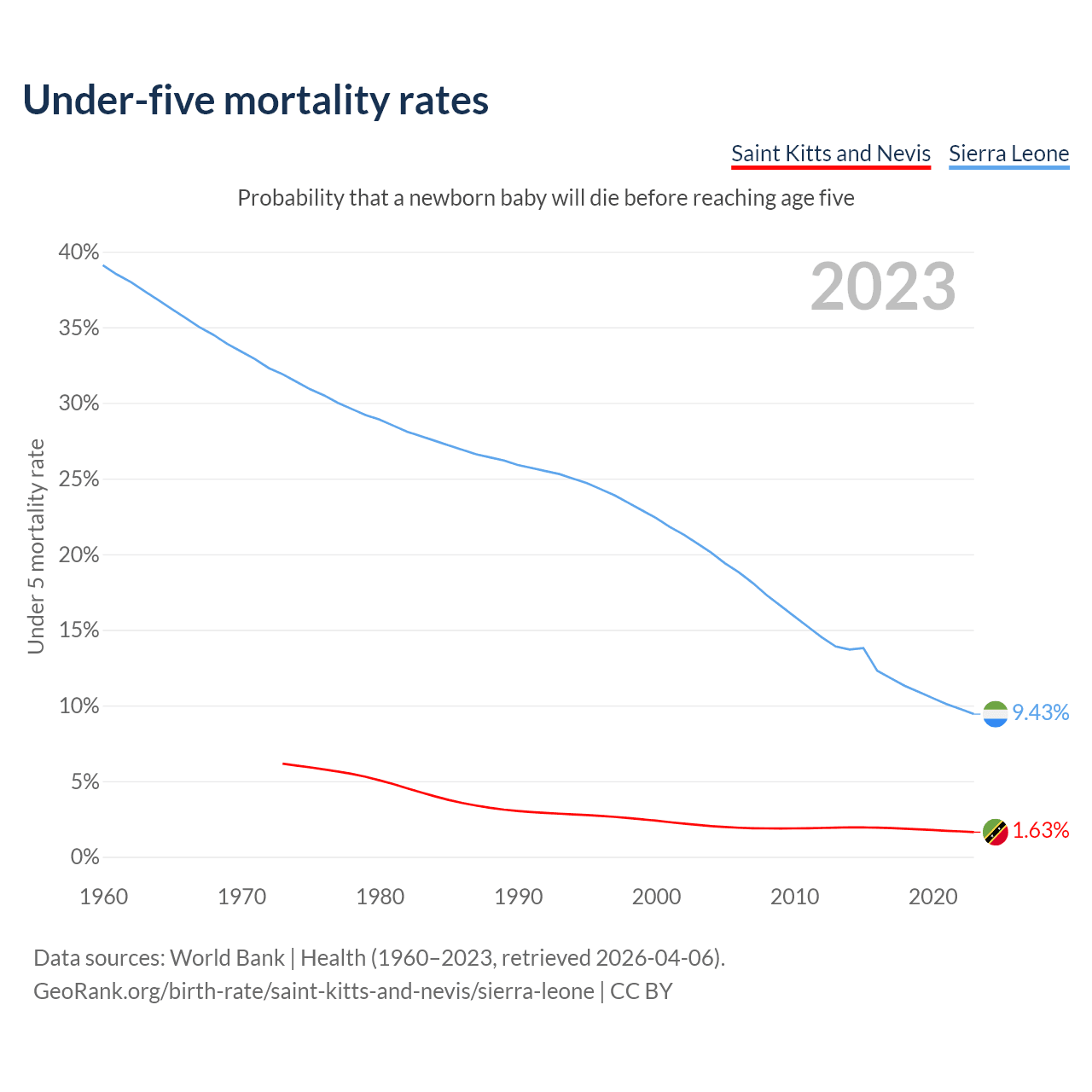 The chance that a newborn baby will die before reaching age five is 1.63% in Saint Kitts and Nevis and 9.43% in Sierra Leone. Above is a chart with historical data on under-five mortality rates.