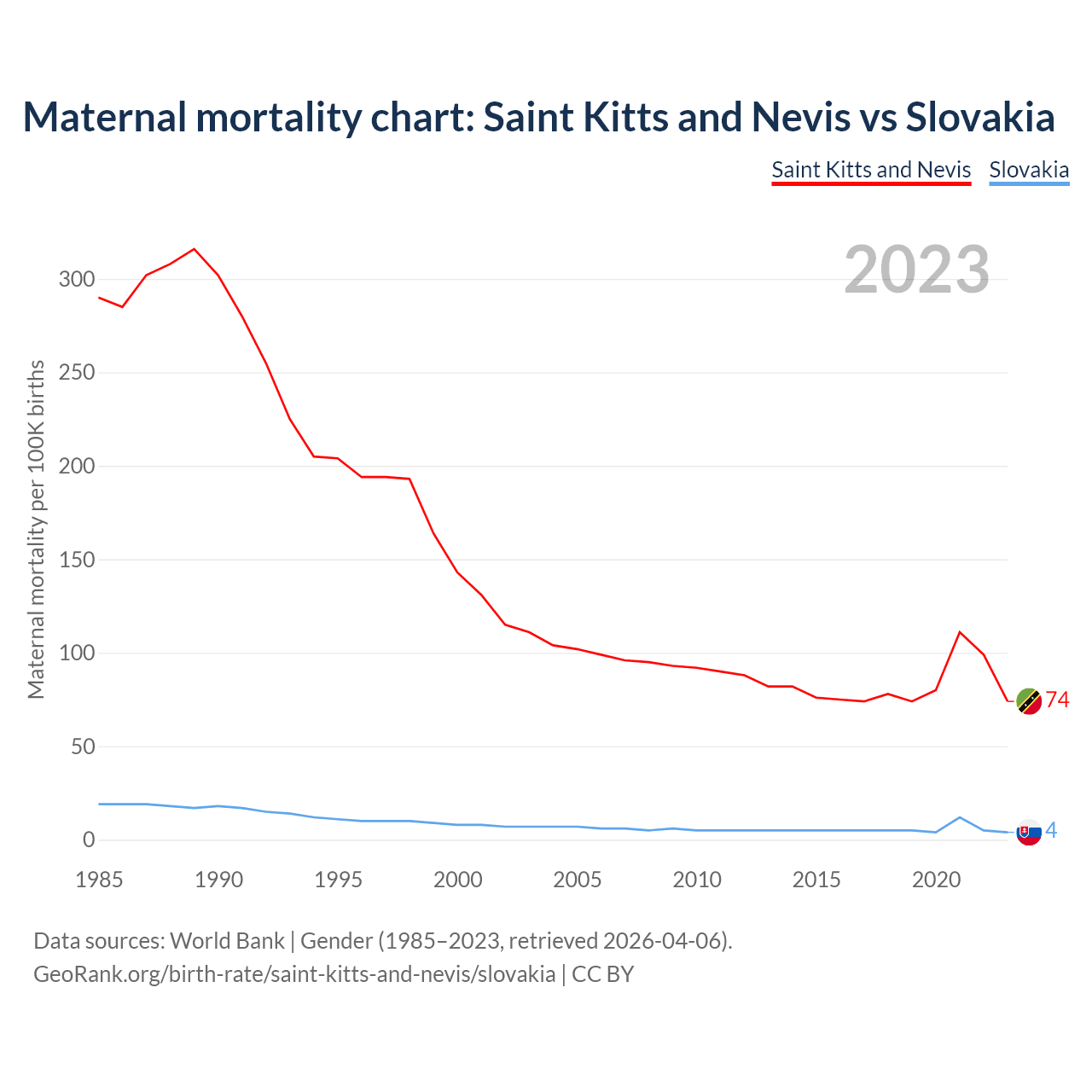 The maternal mortality rate, which is the probability of dying during childbirth or within 42 days of pregnancy termination, is 74 deaths per 100,000 live births in Saint Kitts and Nevis, compared to 4 deaths in Slovakia.