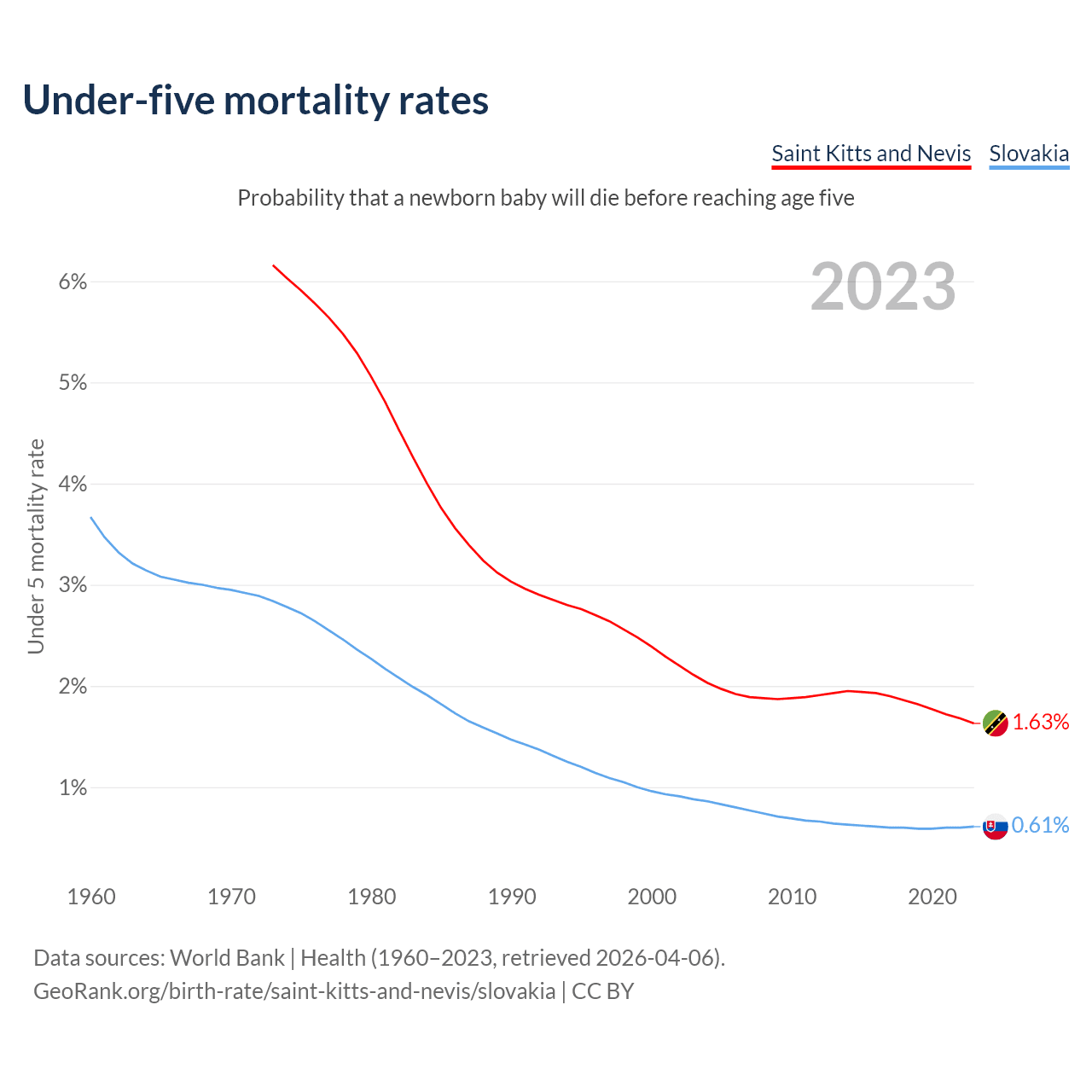 The chance that a newborn baby will die before reaching age five is 1.63% in Saint Kitts and Nevis and 0.61% in Slovakia. Above is a chart with historical data on under-five mortality rates.