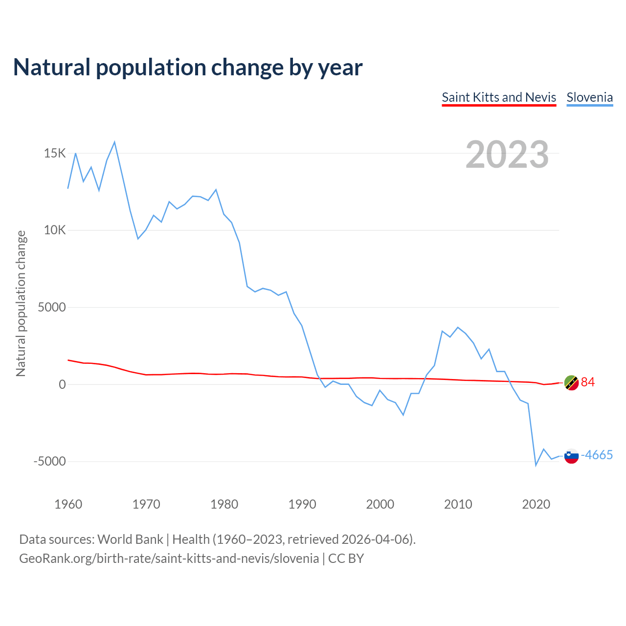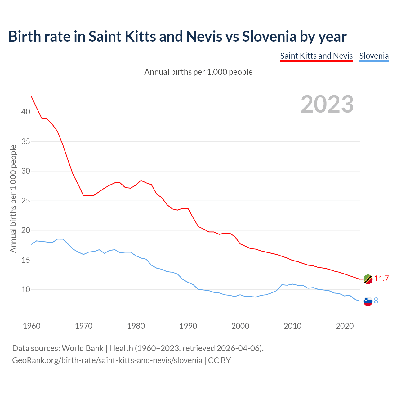 According to the latest available data on birth rates, the fertility rate in Saint Kitts and Nevis was 1.51 children per woman in 2023, compared to 1.51 in Slovenia in 2023. The replacement level is considered to be 2.1 children per woman.