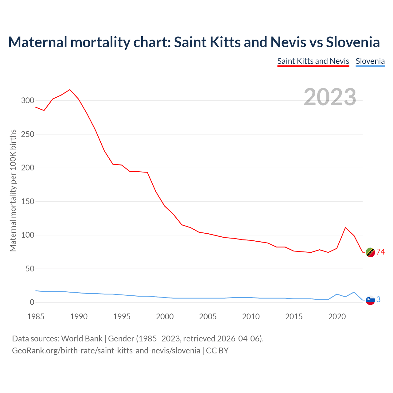 The maternal mortality rate, which is the probability of dying during childbirth or within 42 days of pregnancy termination, is 74 deaths per 100,000 live births in Saint Kitts and Nevis, compared to 3 deaths in Slovenia.
