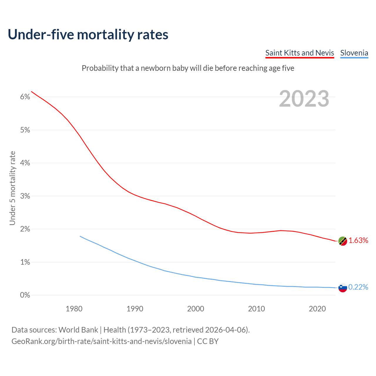 The chance that a newborn baby will die before reaching age five is 1.63% in Saint Kitts and Nevis and 0.22% in Slovenia. Above is a chart with historical data on under-five mortality rates.