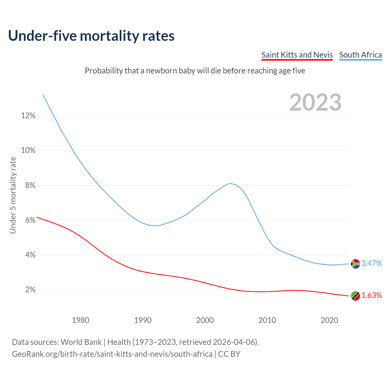 The chance that a newborn baby will die before reaching age five is 1.63% in Saint Kitts and Nevis and 3.47% in South Africa. Above is a chart with historical data on under-five mortality rates.
