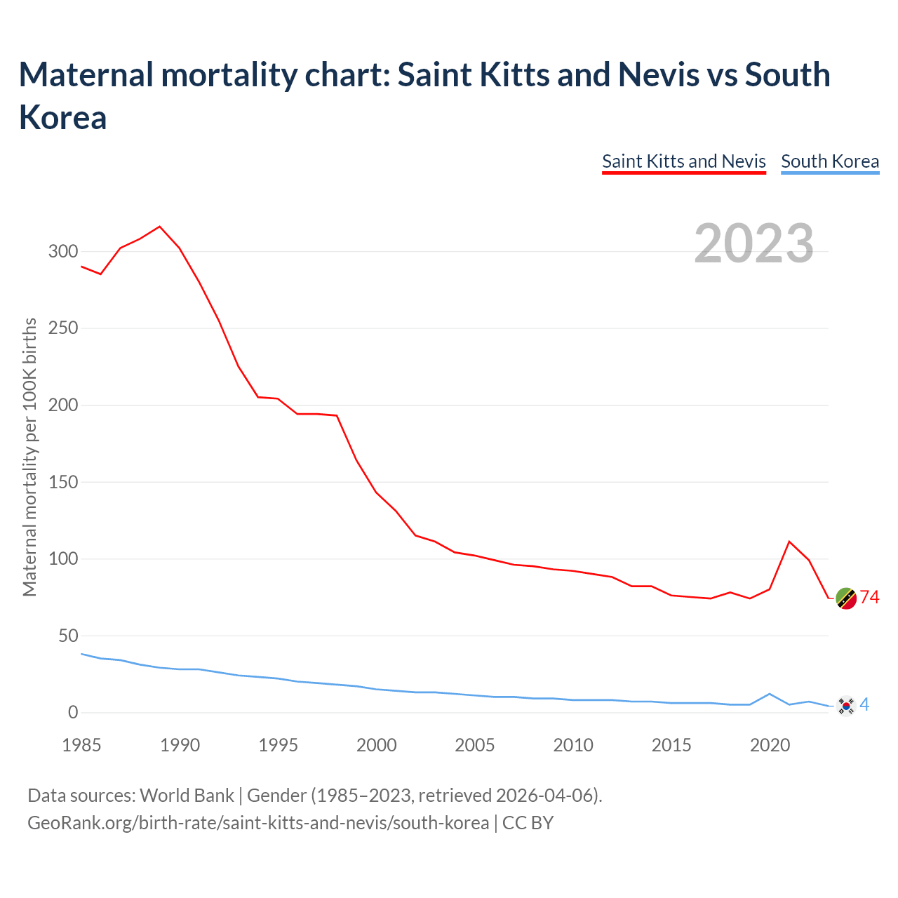 The maternal mortality rate, which is the probability of dying during childbirth or within 42 days of pregnancy termination, is 74 deaths per 100,000 live births in Saint Kitts and Nevis, compared to 4 deaths in South Korea.