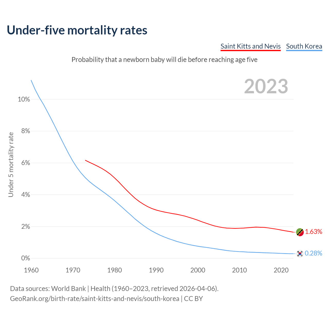 The chance that a newborn baby will die before reaching age five is 1.63% in Saint Kitts and Nevis and 0.28% in South Korea. Above is a chart with historical data on under-five mortality rates.