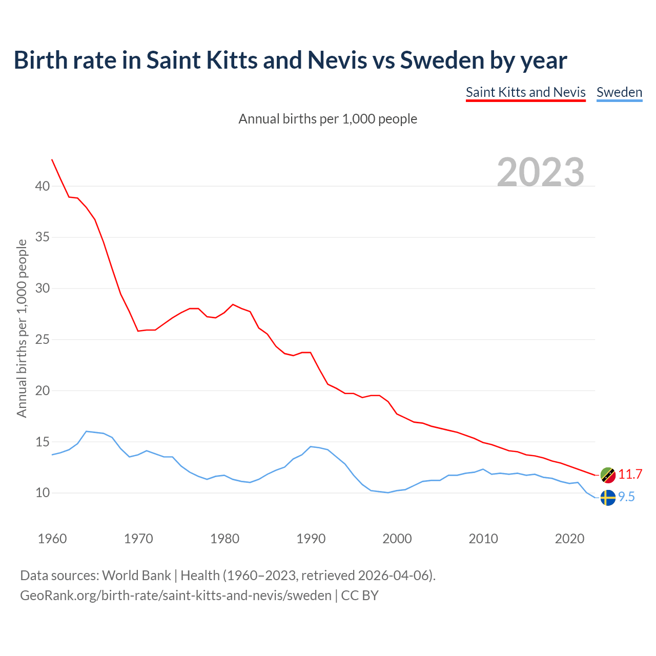 Saint Kitts and Nevis has an annual birth rate of 11.7 births per 1,000 people, compared to 9.5 for Sweden. The average number of children a woman is expected to have during her lifetime — the fertility rate, is 1.51 in Saint Kitts and Nevis and 1.45 in Sweden — 3.65% difference.