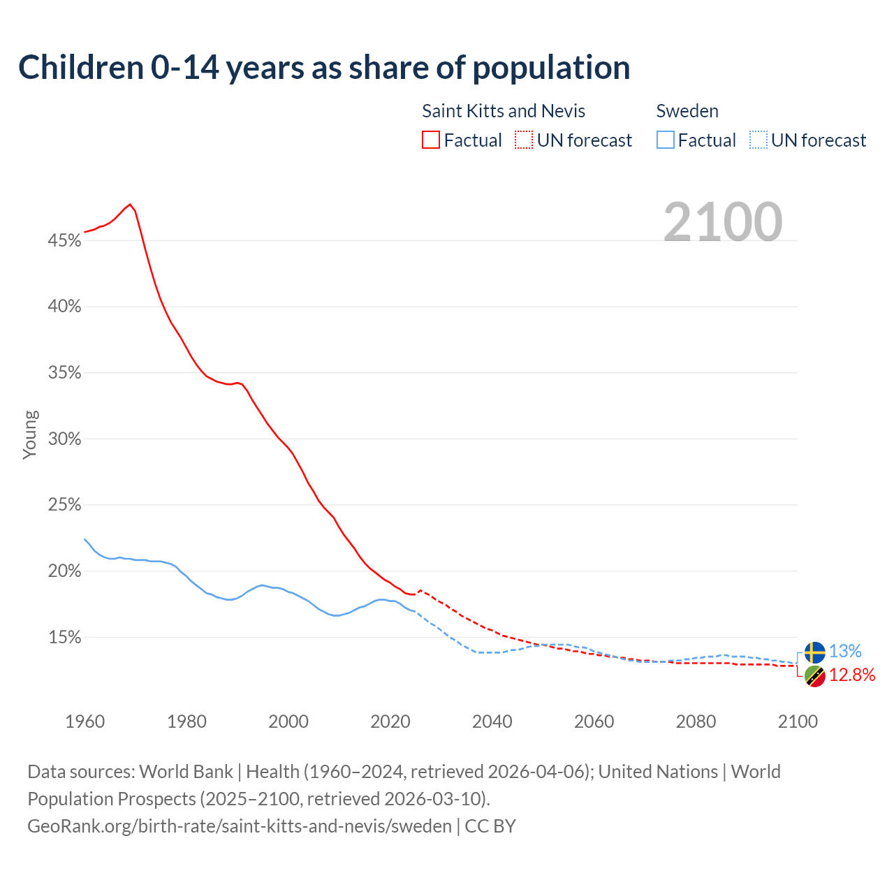 According to the latest available data on birth rates, the fertility rate in Saint Kitts and Nevis was 1.51 children per woman in 2023, compared to 1.45 in Sweden in 2023. The replacement level is considered to be 2.1 children per woman.