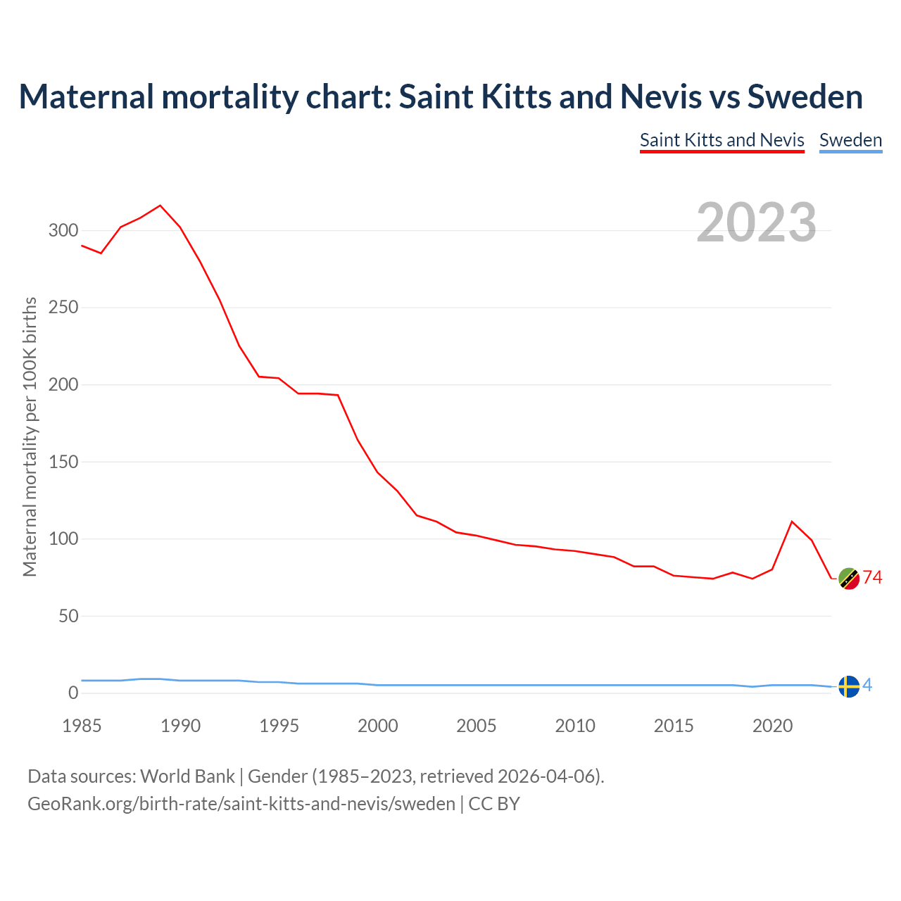 The maternal mortality rate, which is the probability of dying during childbirth or within 42 days of pregnancy termination, is 74 deaths per 100,000 live births in Saint Kitts and Nevis, compared to 4 deaths in Sweden.