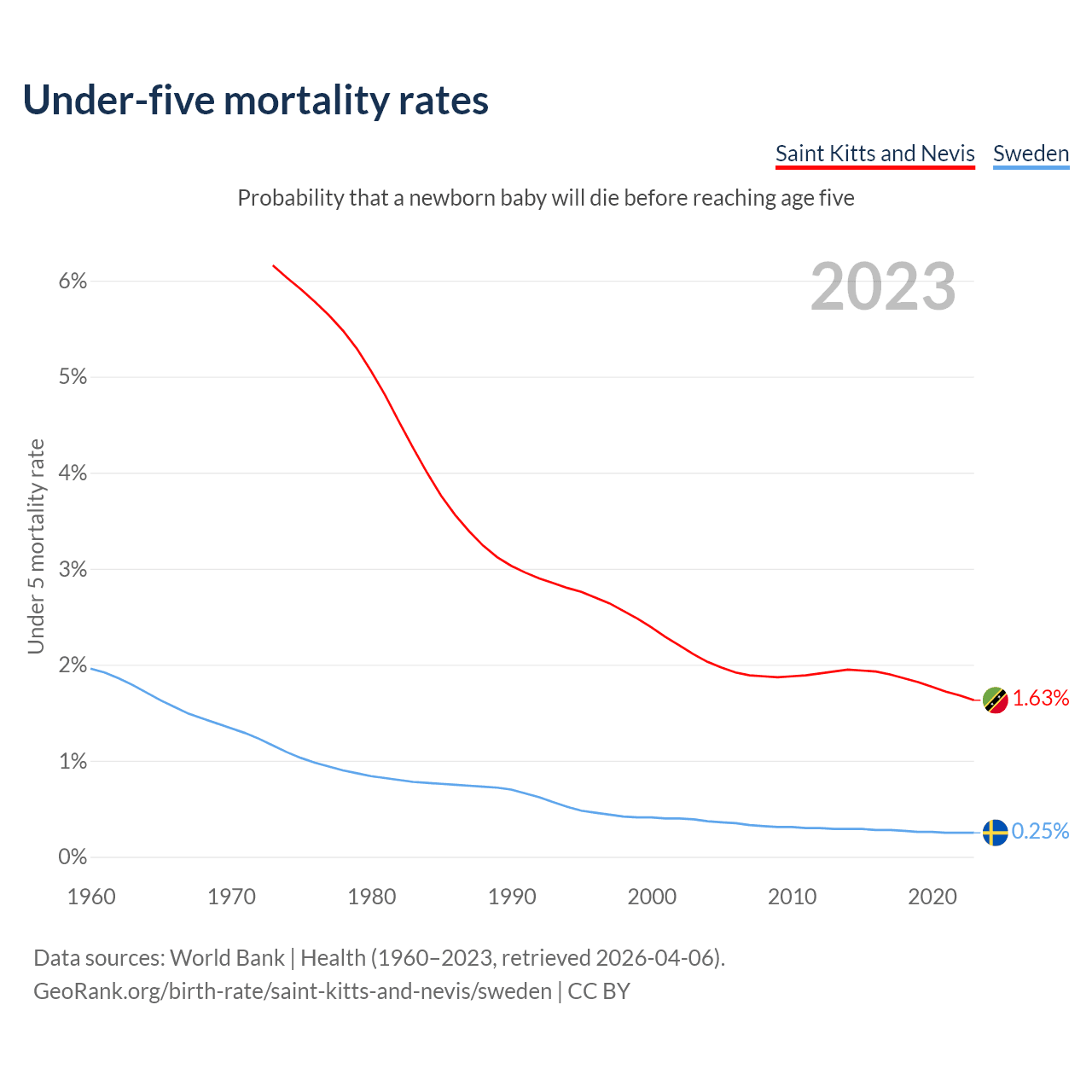 The chance that a newborn baby will die before reaching age five is 1.63% in Saint Kitts and Nevis and 0.25% in Sweden. Above is a chart with historical data on under-five mortality rates.