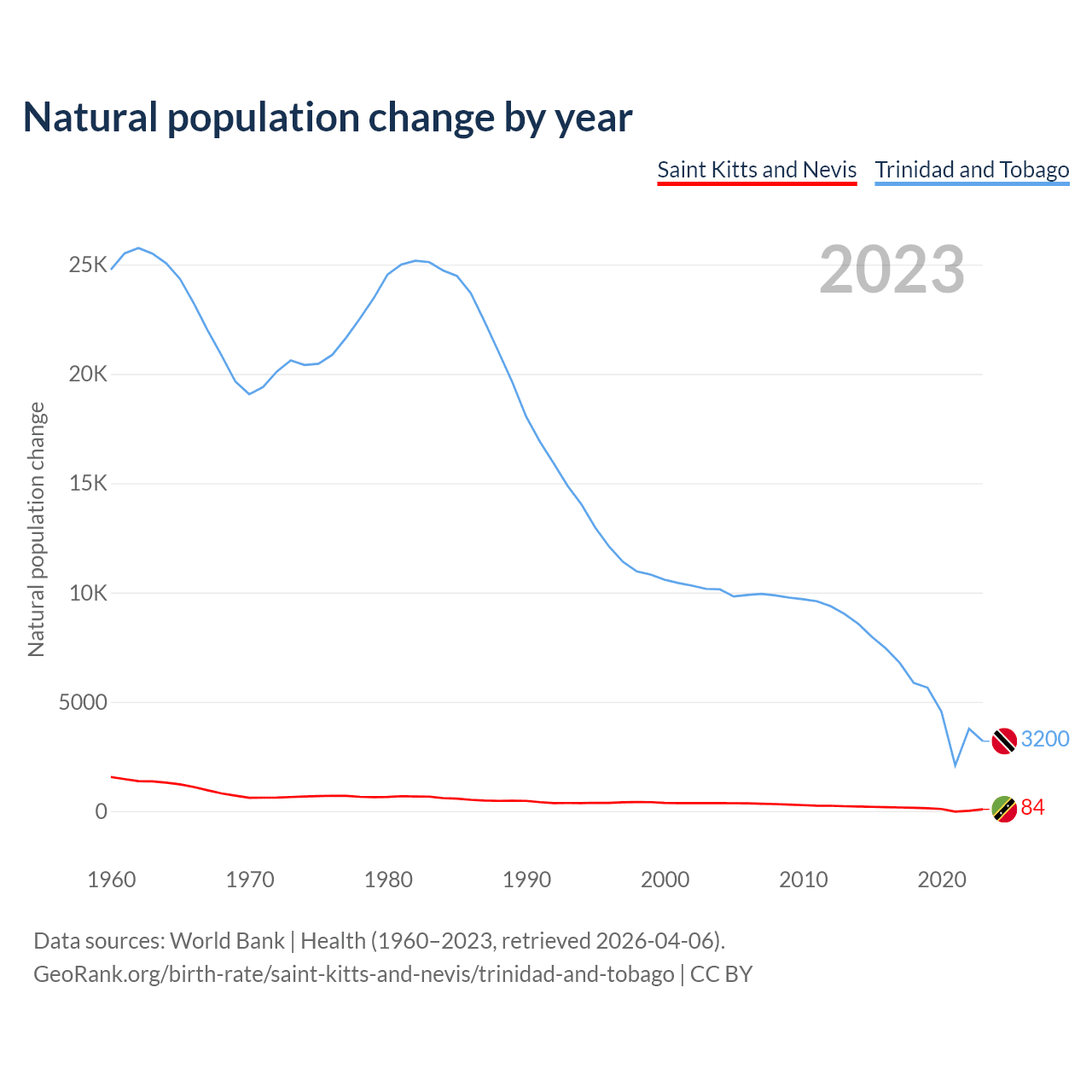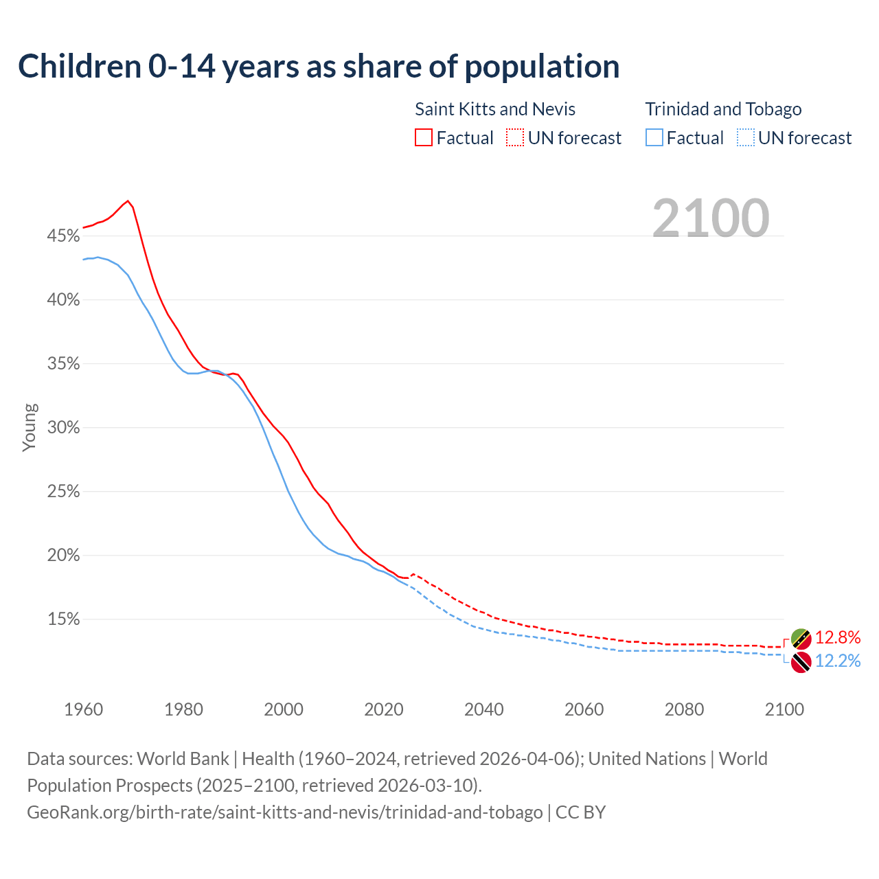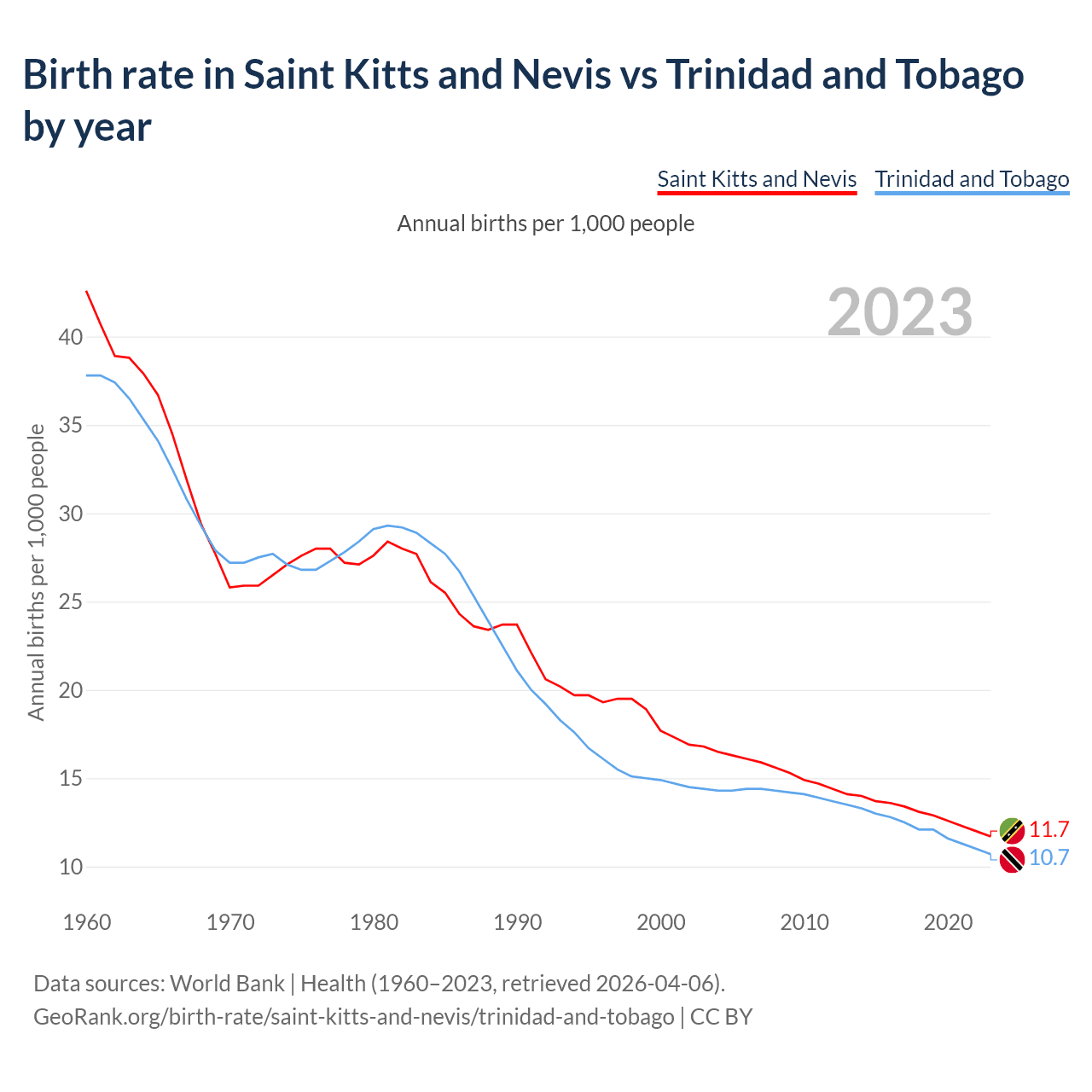 According to the latest available data on birth rates, the fertility rate in Saint Kitts and Nevis was 1.51 children per woman in 2023, compared to 1.53 in Trinidad and Tobago in 2023. The replacement level is considered to be 2.1 children per woman.