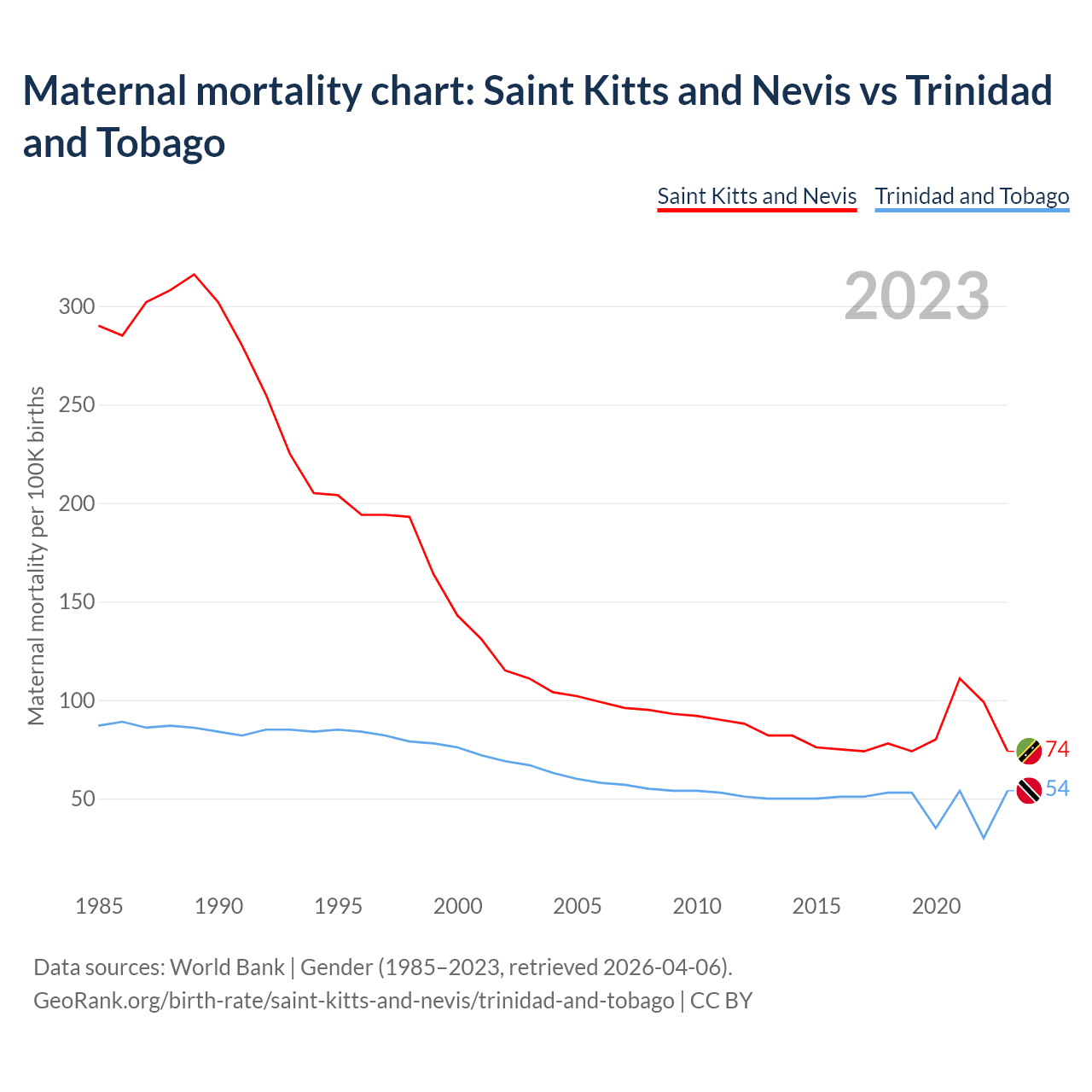 The maternal mortality rate, which is the probability of dying during childbirth or within 42 days of pregnancy termination, is 74 deaths per 100,000 live births in Saint Kitts and Nevis, compared to 54 deaths in Trinidad and Tobago.