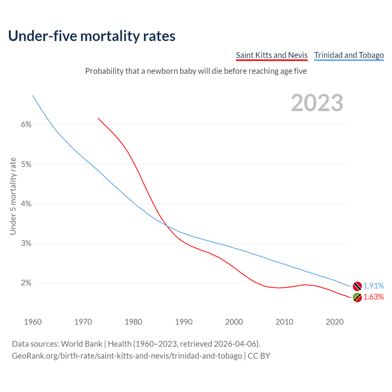 The chance that a newborn baby will die before reaching age five is 1.63% in Saint Kitts and Nevis and 1.91% in Trinidad and Tobago. Above is a chart with historical data on under-five mortality rates.