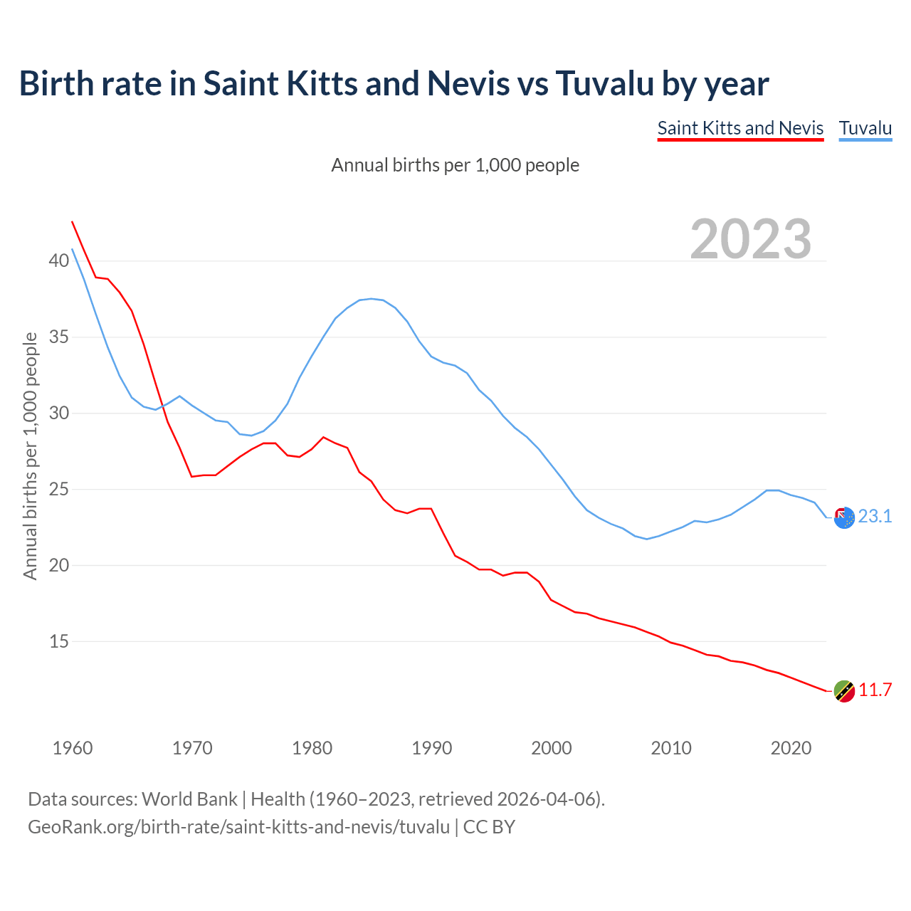 Saint Kitts and Nevis has an annual birth rate of 11.7 births per 1,000 people, compared to 23.1 for Tuvalu. The average number of children a woman is expected to have during her lifetime — the fertility rate, is 1.51 in Saint Kitts and Nevis and 3.21 in Tuvalu — 113.2% difference.