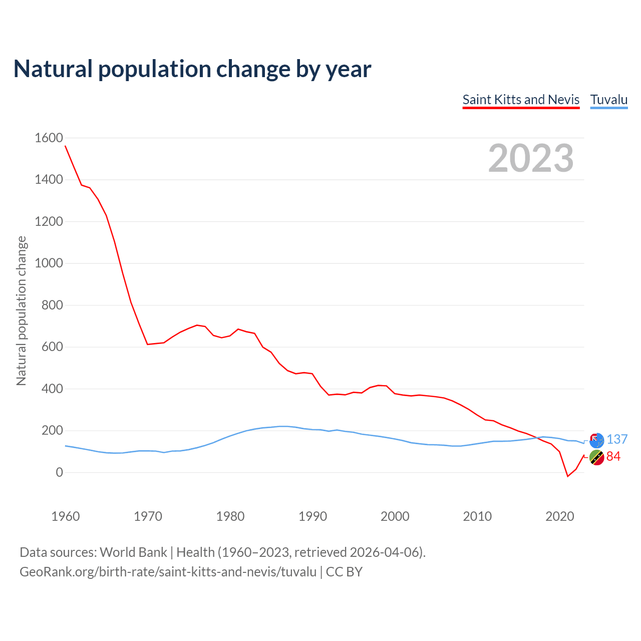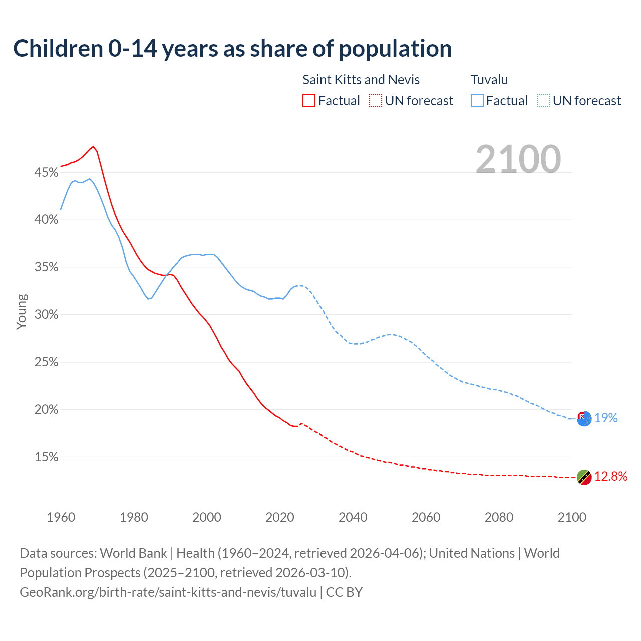 According to the latest available data on birth rates, the fertility rate in Saint Kitts and Nevis was 1.51 children per woman in 2023, compared to 3.21 in Tuvalu in 2023. The replacement level is considered to be 2.1 children per woman.