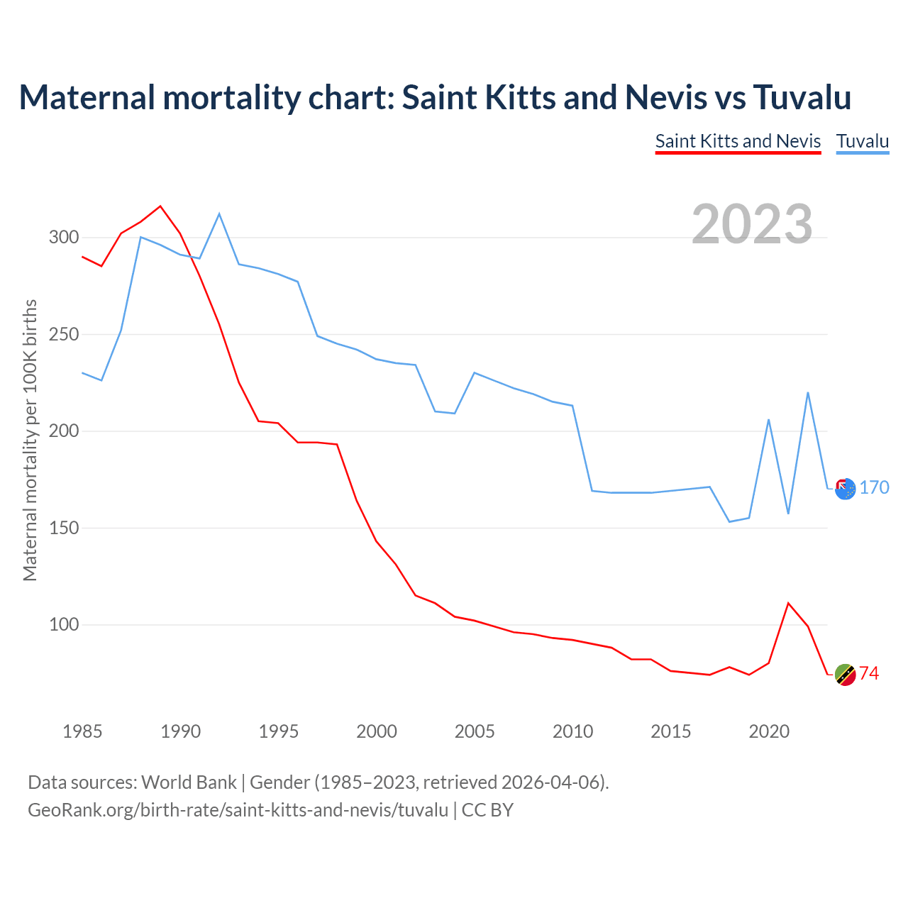 The maternal mortality rate, which is the probability of dying during childbirth or within 42 days of pregnancy termination, is 74 deaths per 100,000 live births in Saint Kitts and Nevis, compared to 170 deaths in Tuvalu.