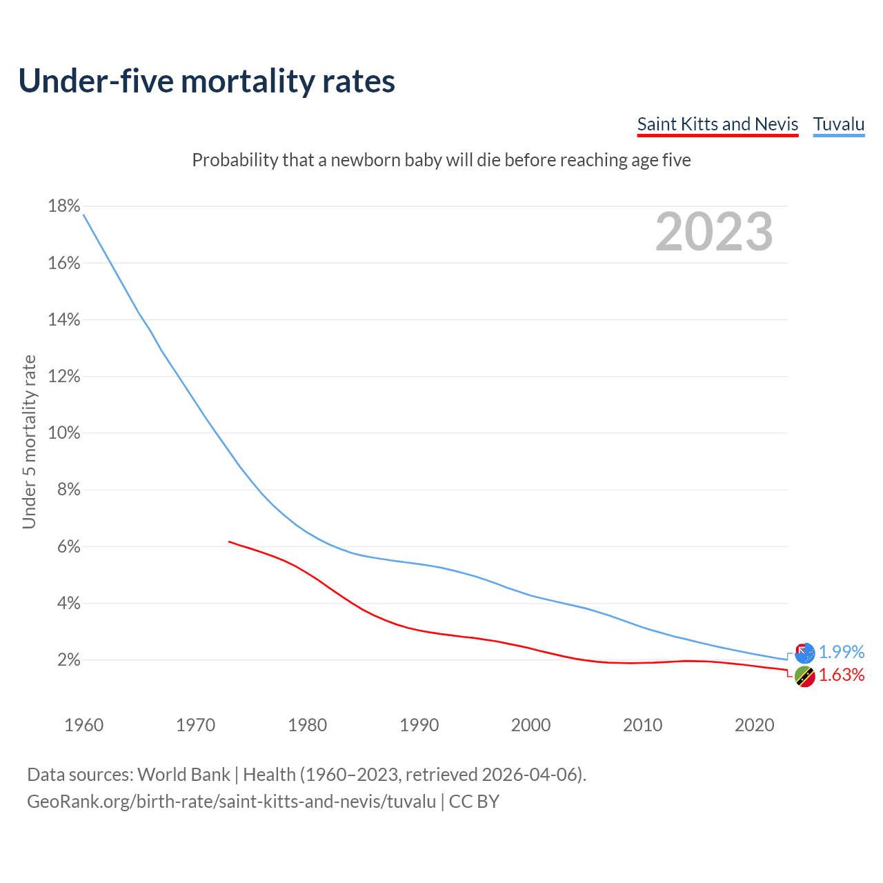 The chance that a newborn baby will die before reaching age five is 1.63% in Saint Kitts and Nevis and 1.99% in Tuvalu. Above is a chart with historical data on under-five mortality rates.