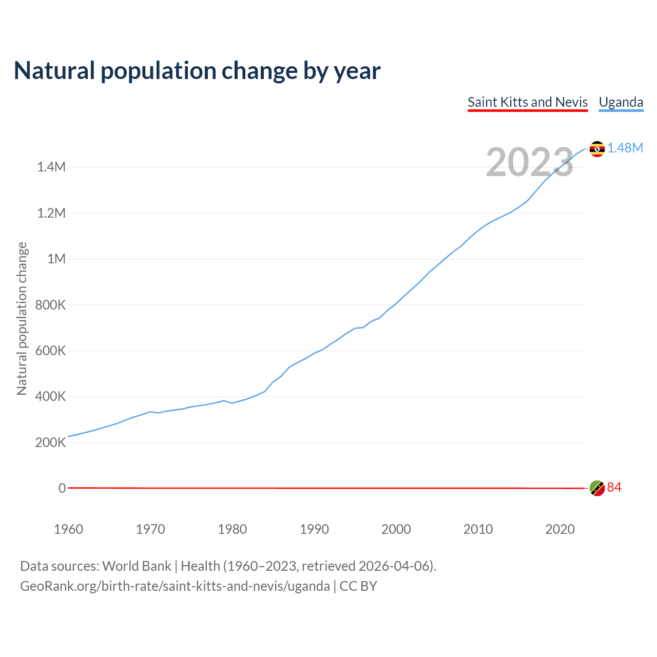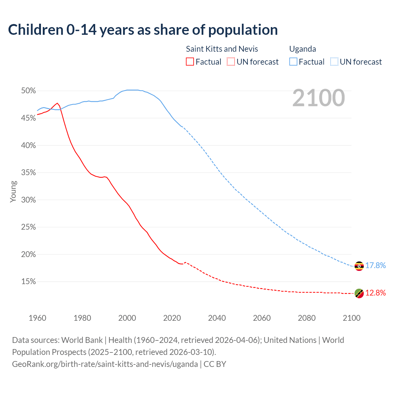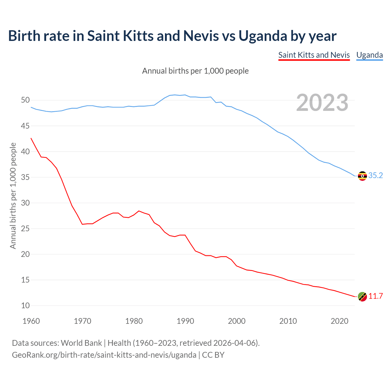 Saint Kitts and Nevis has an annual birth rate of 11.7 births per 1,000 people, compared to 35.2 for Uganda. The average number of children a woman is expected to have during her lifetime — the fertility rate, is 1.51 in Saint Kitts and Nevis and 4.28 in Uganda — 184.6% difference.