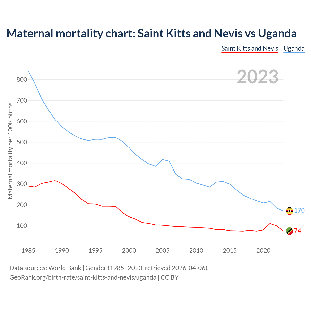 The maternal mortality rate, which is the probability of dying during childbirth or within 42 days of pregnancy termination, is 74 deaths per 100,000 live births in Saint Kitts and Nevis, compared to 170 deaths in Uganda.