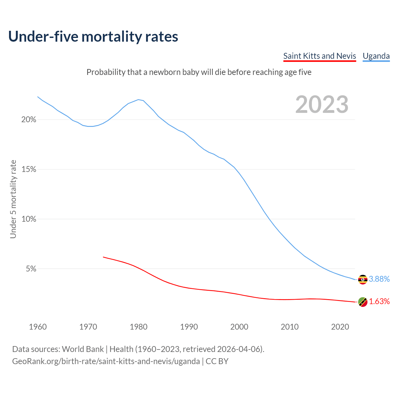 The chance that a newborn baby will die before reaching age five is 1.63% in Saint Kitts and Nevis and 3.88% in Uganda. Above is a chart with historical data on under-five mortality rates.