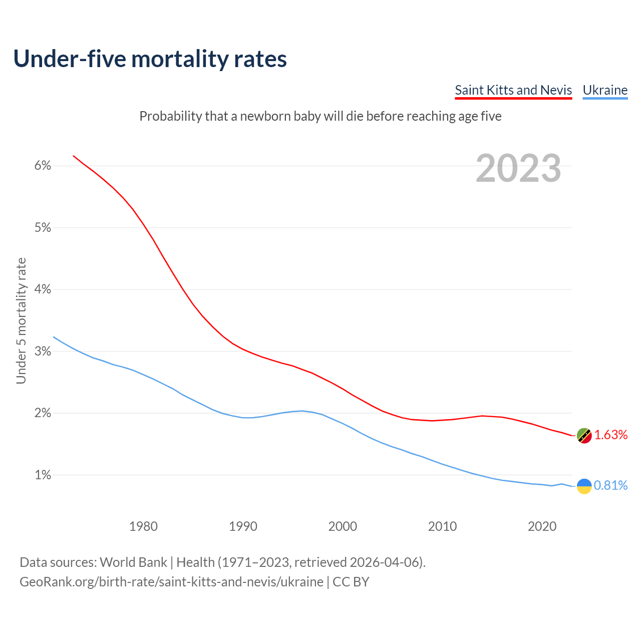 The chance that a newborn baby will die before reaching age five is 1.63% in Saint Kitts and Nevis and 0.81% in Ukraine. Above is a chart with historical data on under-five mortality rates.