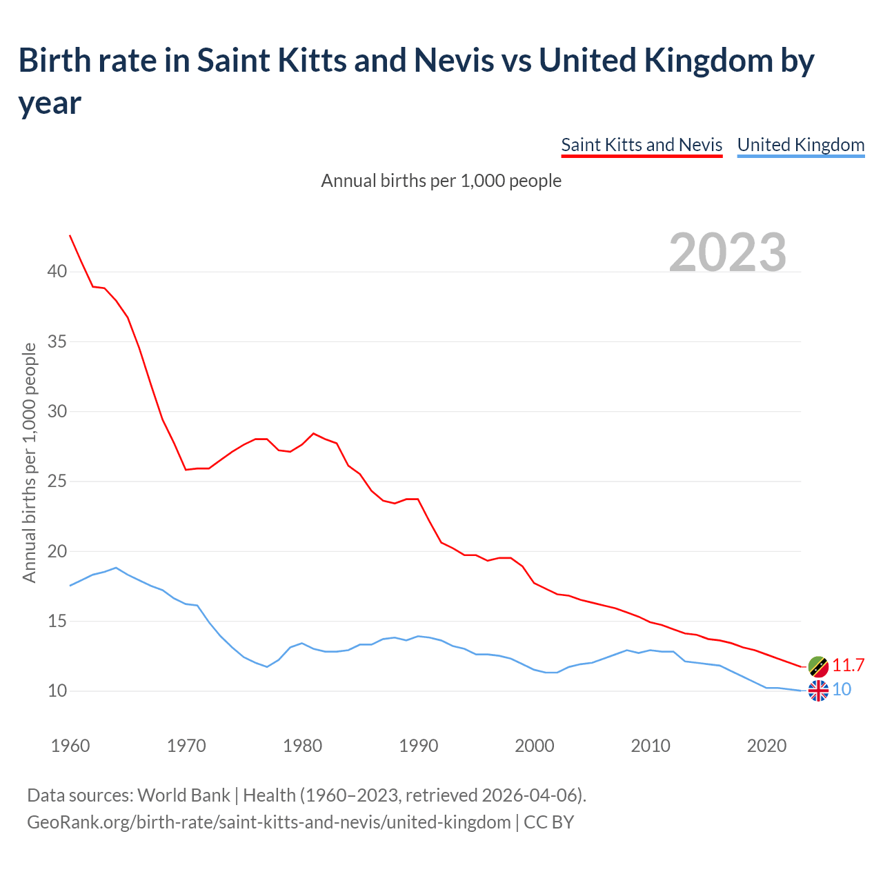 Saint Kitts and Nevis has an annual birth rate of 11.7 births per 1,000 people, compared to 10 for the United Kingdom. The average number of children a woman is expected to have during her lifetime — the fertility rate, is 1.51 in Saint Kitts and Nevis and 1.56 in the United Kingdom — 3.65% difference.