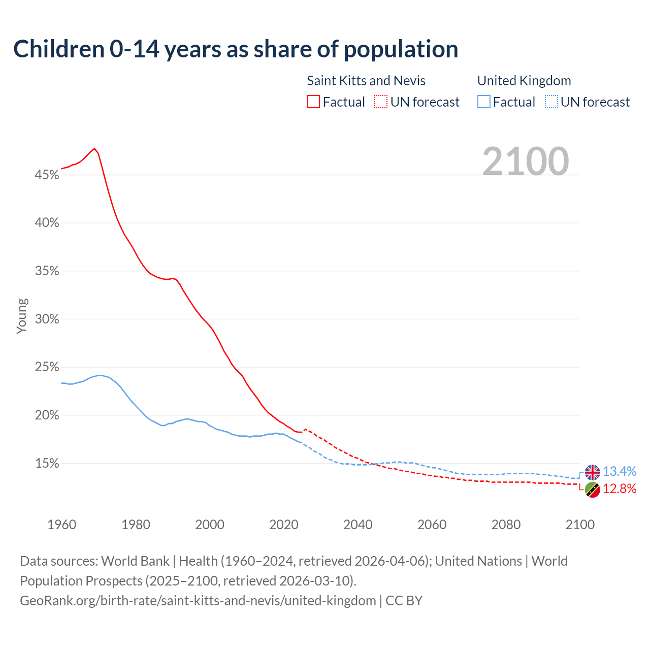 According to the latest available data on birth rates, the fertility rate in Saint Kitts and Nevis was 1.51 children per woman in 2023, compared to 1.56 in the United Kingdom in 2023. The replacement level is considered to be 2.1 children per woman.